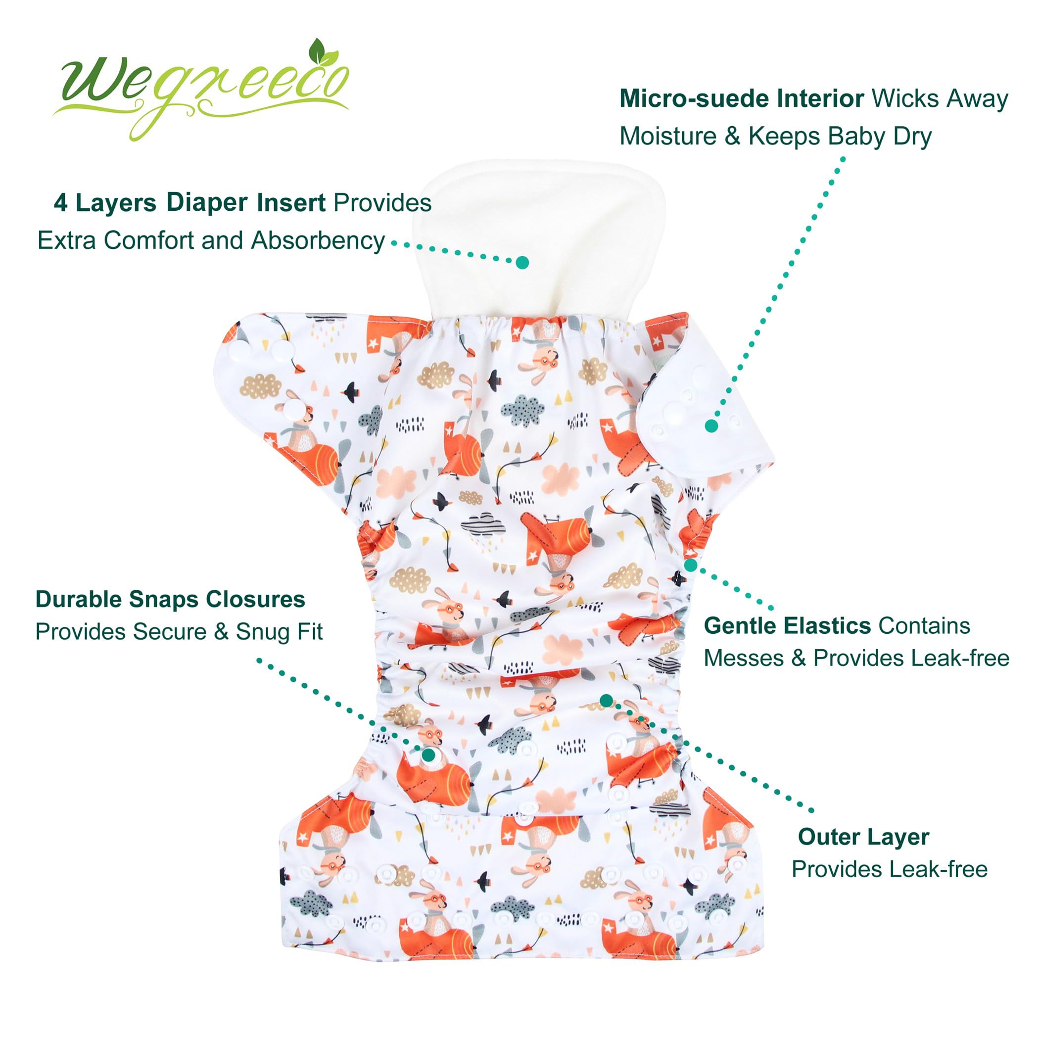 One Size Adjustable Diaper: Three rows of adjustable snaps to allow for a small, medium, large size in one diaper; Usually fit zero-two years' baby; If you are looking for a pocket diaper to last through your baby’s infancy, toddlerhood and even future babies; Wegreeco baby diapers grow with your baby