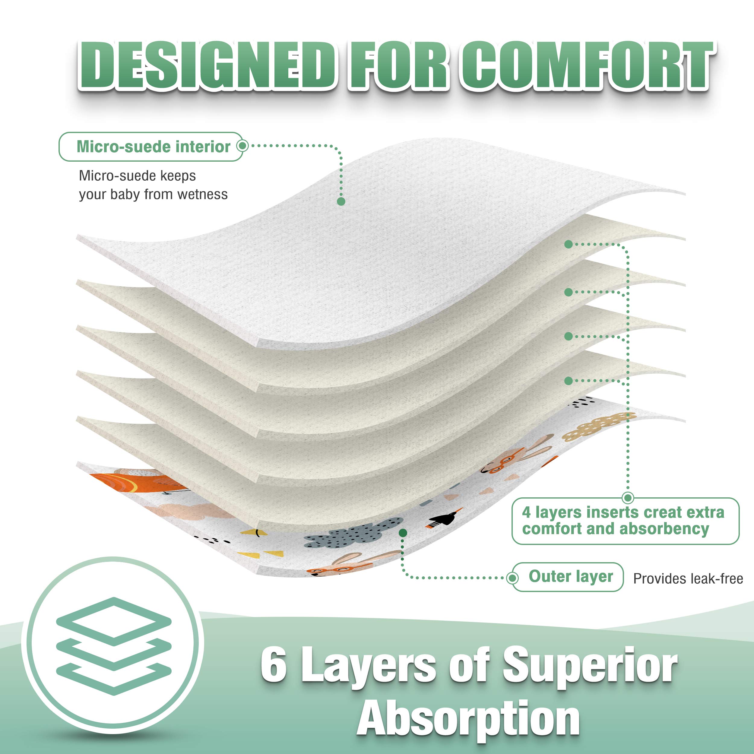 Absorbent and Soft Insert: Inserts are made of 4 layers fibre, the strong absorbent material with breathability and softness is gentle on your baby’s bottom, keep your baby comfortable and happy; The inner suede cloth touches baby, and wicks moisture away from baby's bottom to the insert