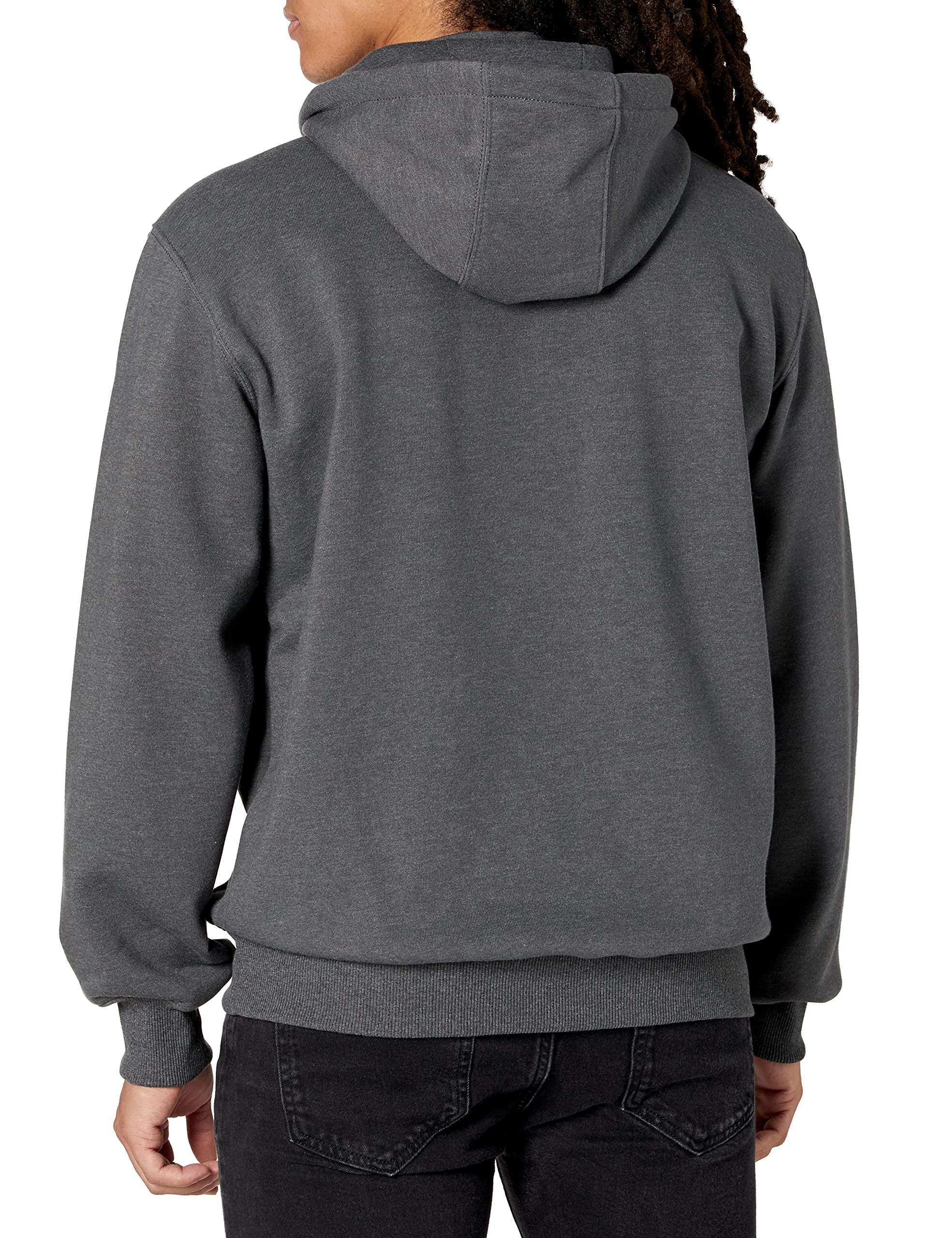Description The heavyweight champion of sweatshirts is made of 13-ounce, 75% cotton/25% polyester fabric and has a Rain Defender durable water-repellent finish. The zip-mock collar has an 8-inch antique-finish brass zipper. It is designed with spandex-reinforced rib-knit cuffs and waistband to keep the cold out. There's an attached three-piece jersey-lined hood with draw cord and front hand-warmer pocket. The Carhartt logo is embroidered on the front left pocket.