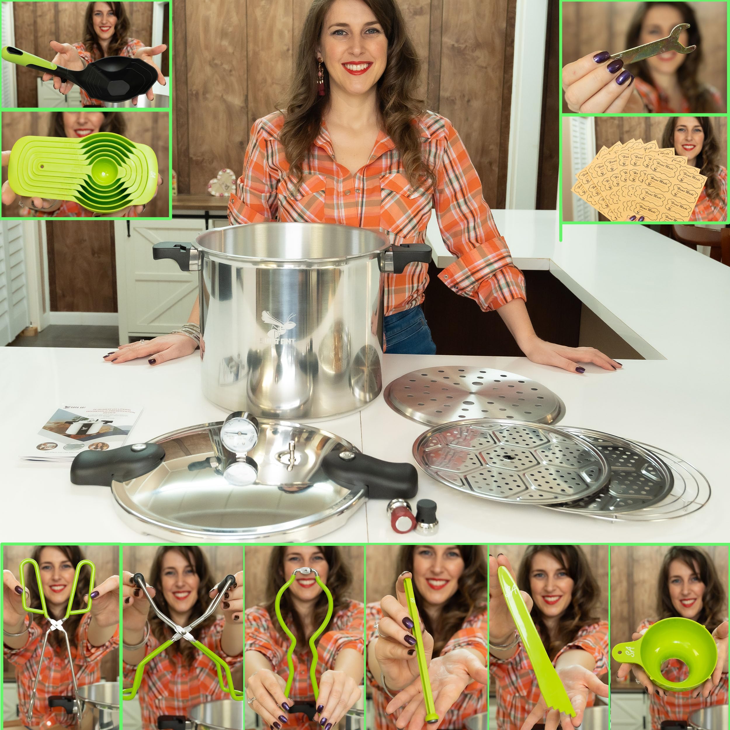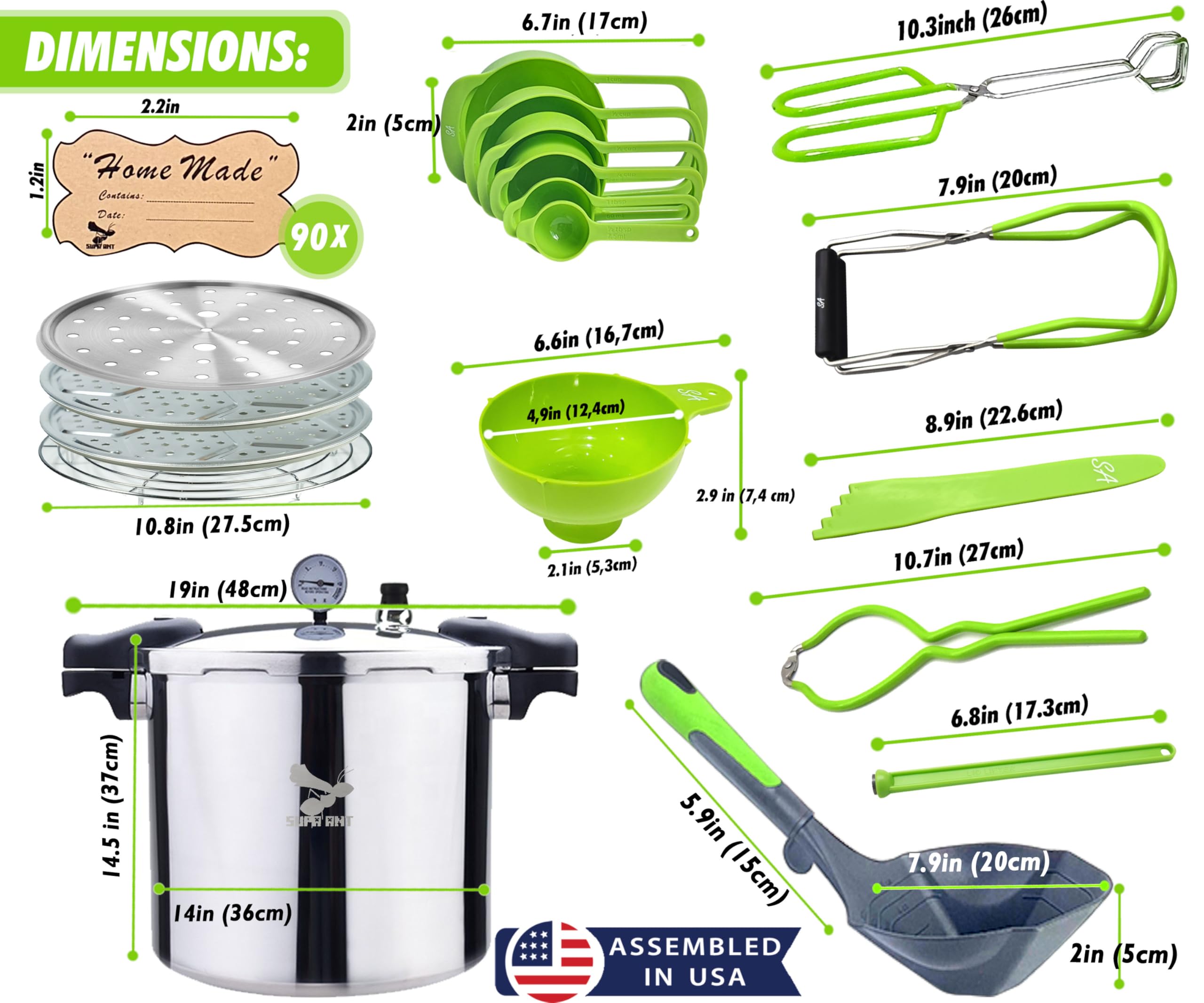 High Capacity Canning Pot: Large 23-quart capacity pressure canner allows you to can in large batches, perfect addition to your canning supplies. The olla de presion is equipped with an overpressure plug, air vent/cover lock, and locking lid that prevents opening while there is pressure inside, ensuring safe operation at all times. The canner pressure cooker for canning includes essential canning kit such as a jar lifter, canning funnel, magnetic lid lifter, bubble remover, and jar wrench for a complete canning experience
