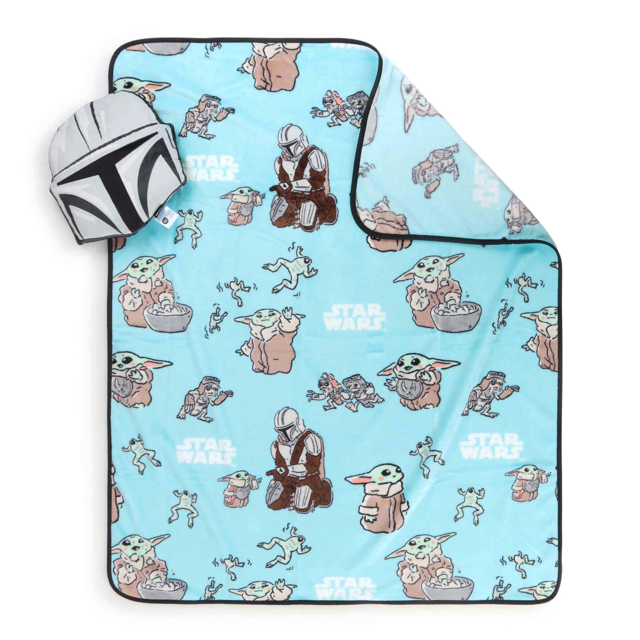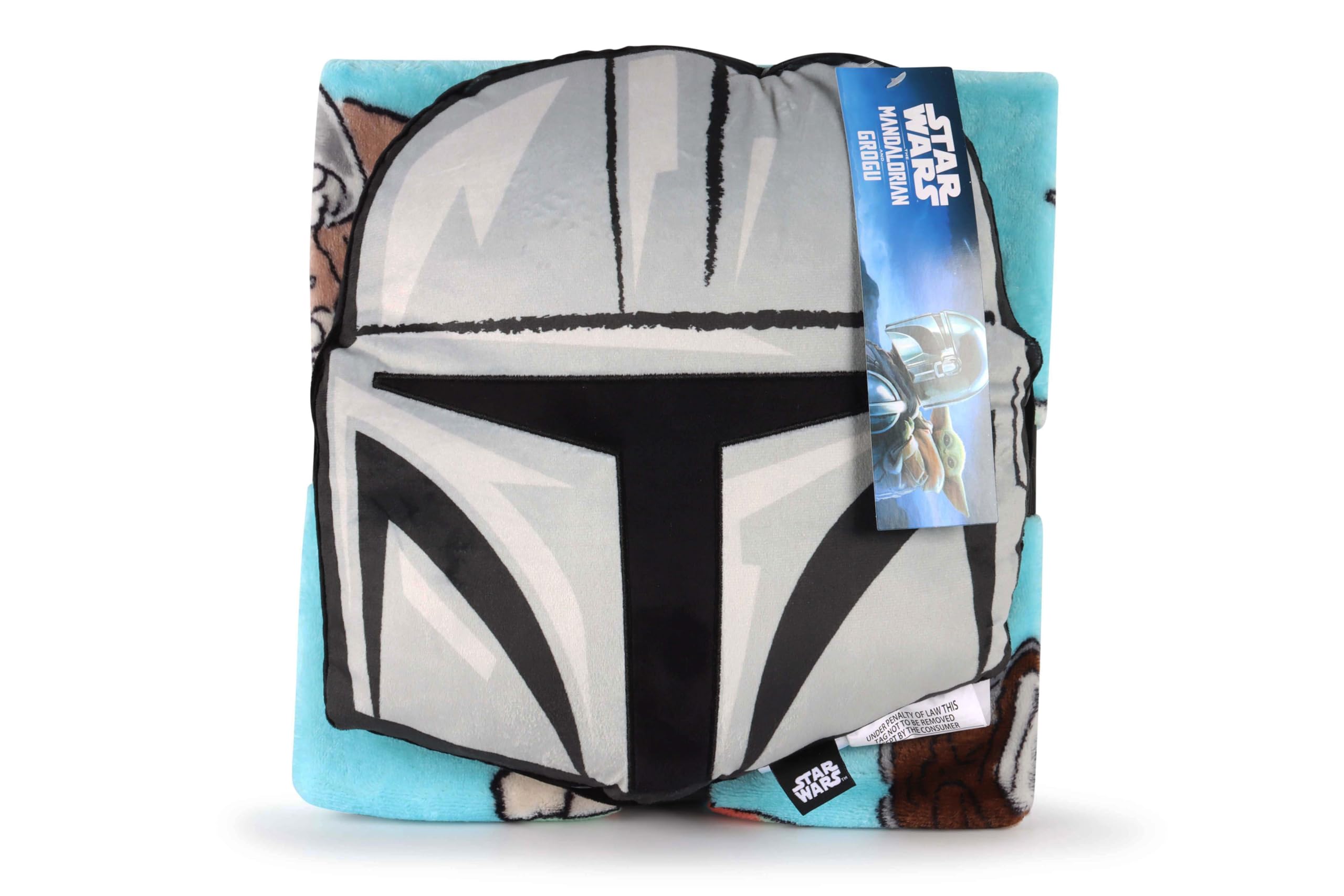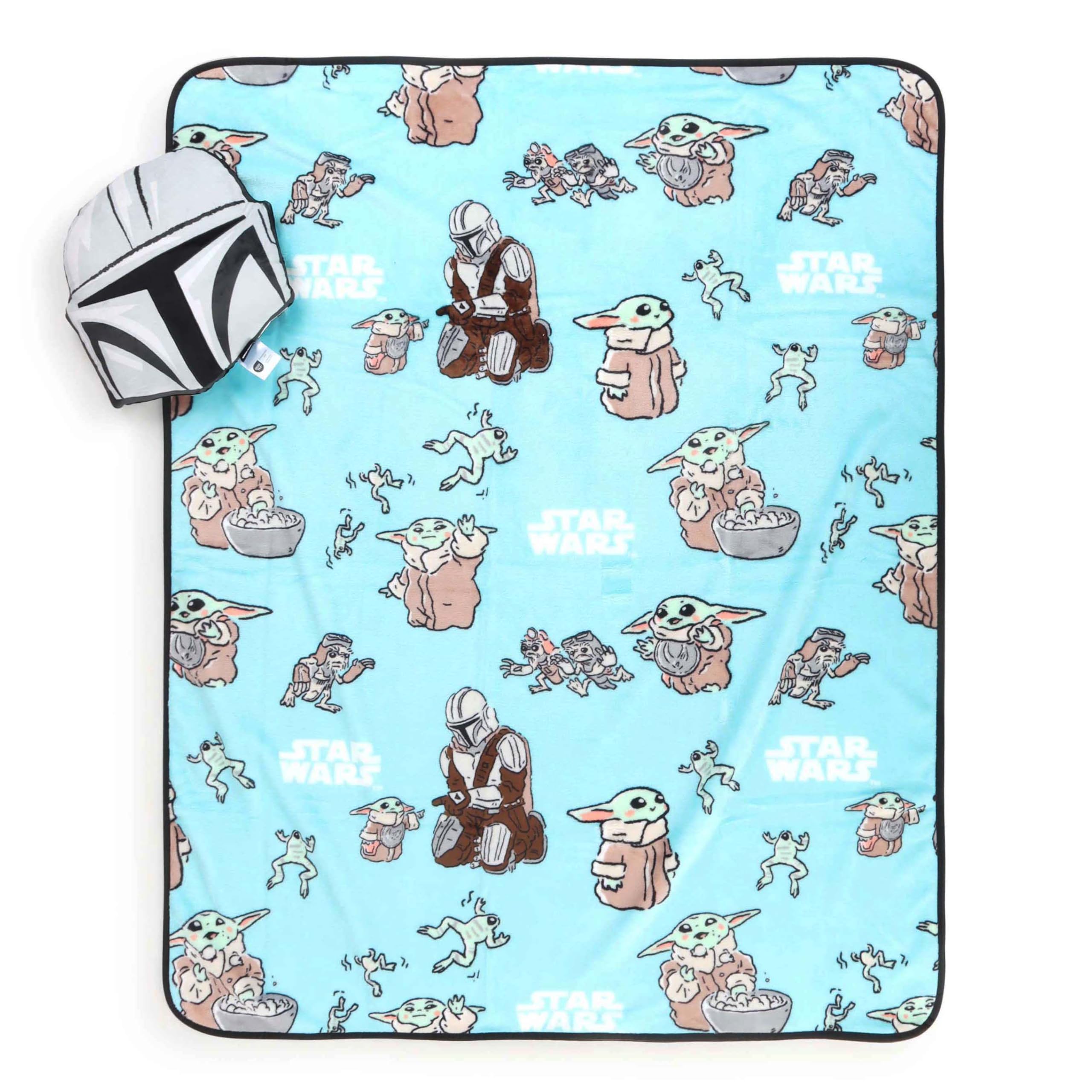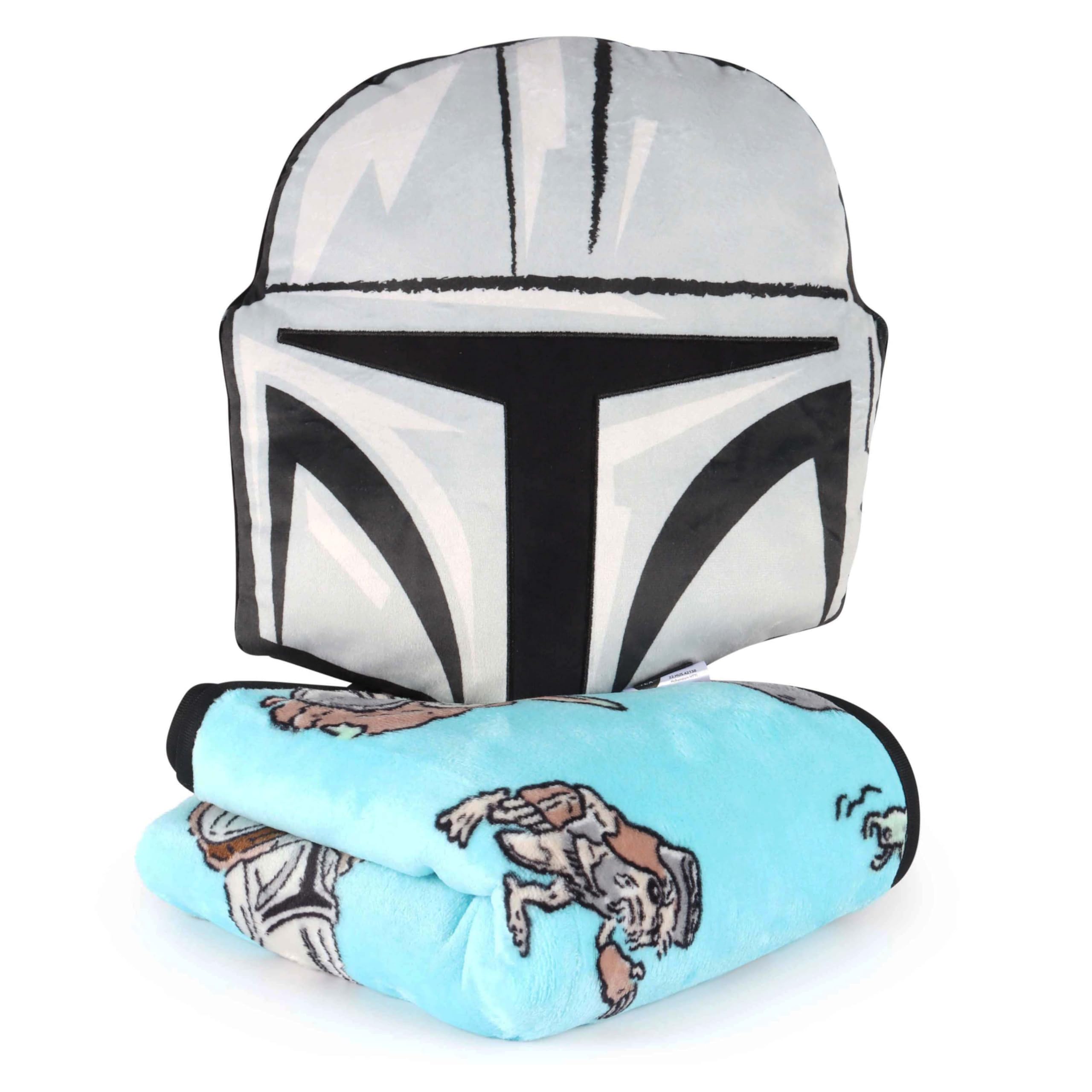 Celebrate cozy moments with the The Mandalorian Nogginz Pillow & Throw Set! Featuring an all-over pattern of the Mandalorian and Grogu (The Child) paired with a coordinating Mandalorian helmet Nogginz pillow, this set captures the heartwarming bond and adventurous spirit fans love from the series. This adorable 2-piece set includes a plush nogginz pillow and a matching fleece throw. This officially licensed set brings comfort and cuteness to every snuggle session. The nogginz pillow measures 12” tall—ideal for hugging or decorating—while the super-soft 40” x 50” throw is crafted from 100% brushed microfiber, making it lightweight, cozy, and gentle on skin. Whether for bedtime, car rides, movie nights, or sleepovers, this set makes relaxation extra fun and festive. Plus, both pieces are machine washable for easy care. A must-have for The Mandalorian lovers, this set makes a cheerful gift for birthdays, holidays, or simply adding a touch to any space!