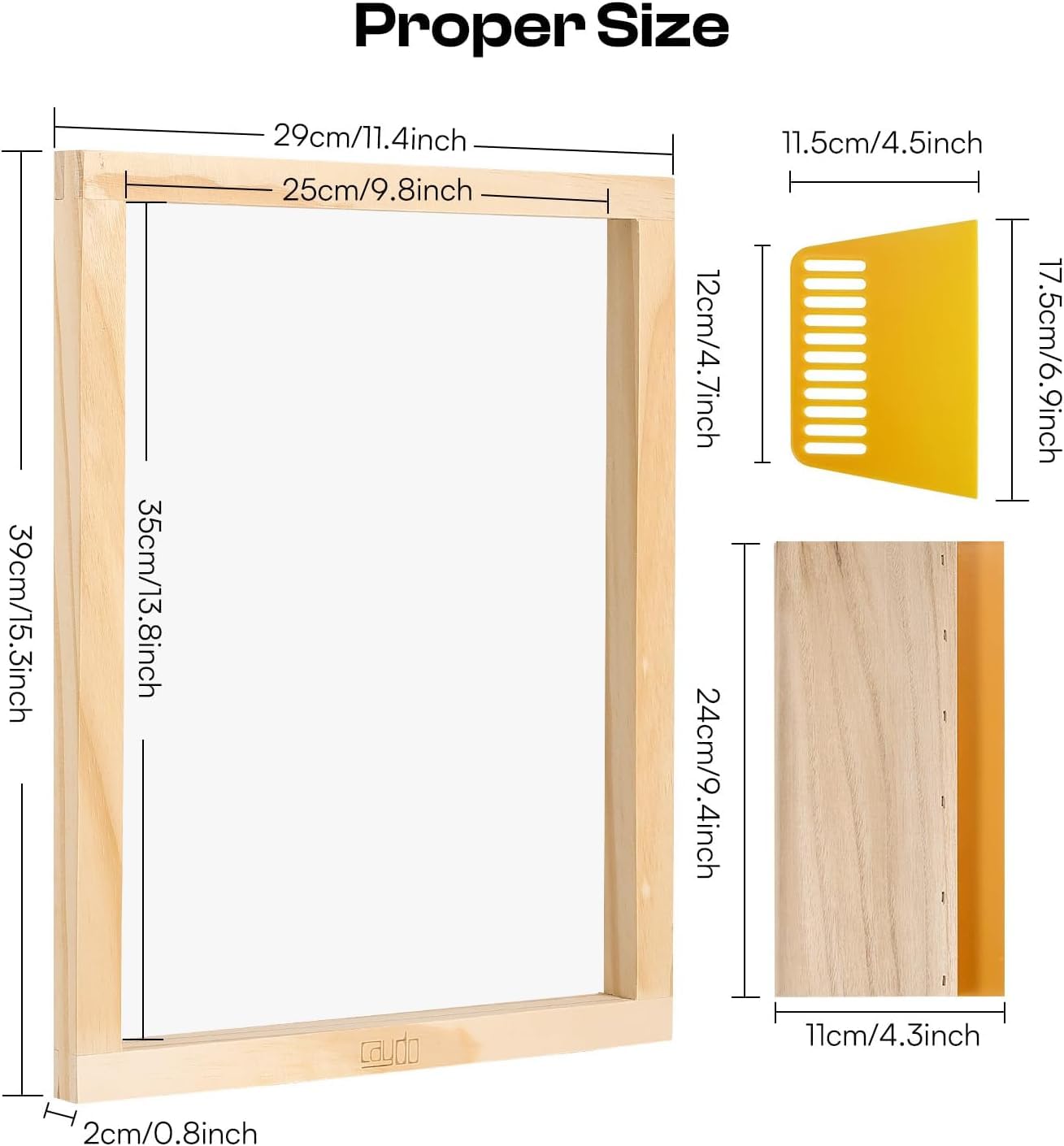 Suitable Size: Our wooden screen printing screen measures 10 x 14 x 0.8 inches, the wooden squeegee for screen printing measures 9.4 x 4.3 inches, and the plastic scraper measures 6.9 x 4.7 x 4.5 inches, suitable for daily DIY projects and serious printing work