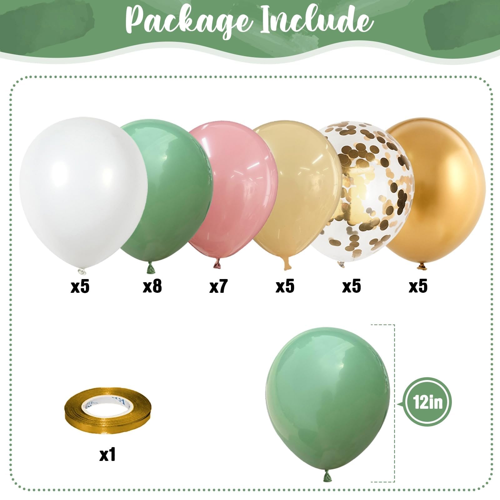🎉 Dusty Green Pink Gold Balloons - You will get 35 pieces 12 inch latex party balloons set, includes olive sage green 8pcs, retro dusty pink 7pcs, apricot 5pcs, matte white 5pcs, metallic gold 5pcs, gold confetti 5pcs, come with 1pc gold balloon ribbon. Perfect for girls women jungle safari birthday baby bridal shower wedding party decorations supplies.