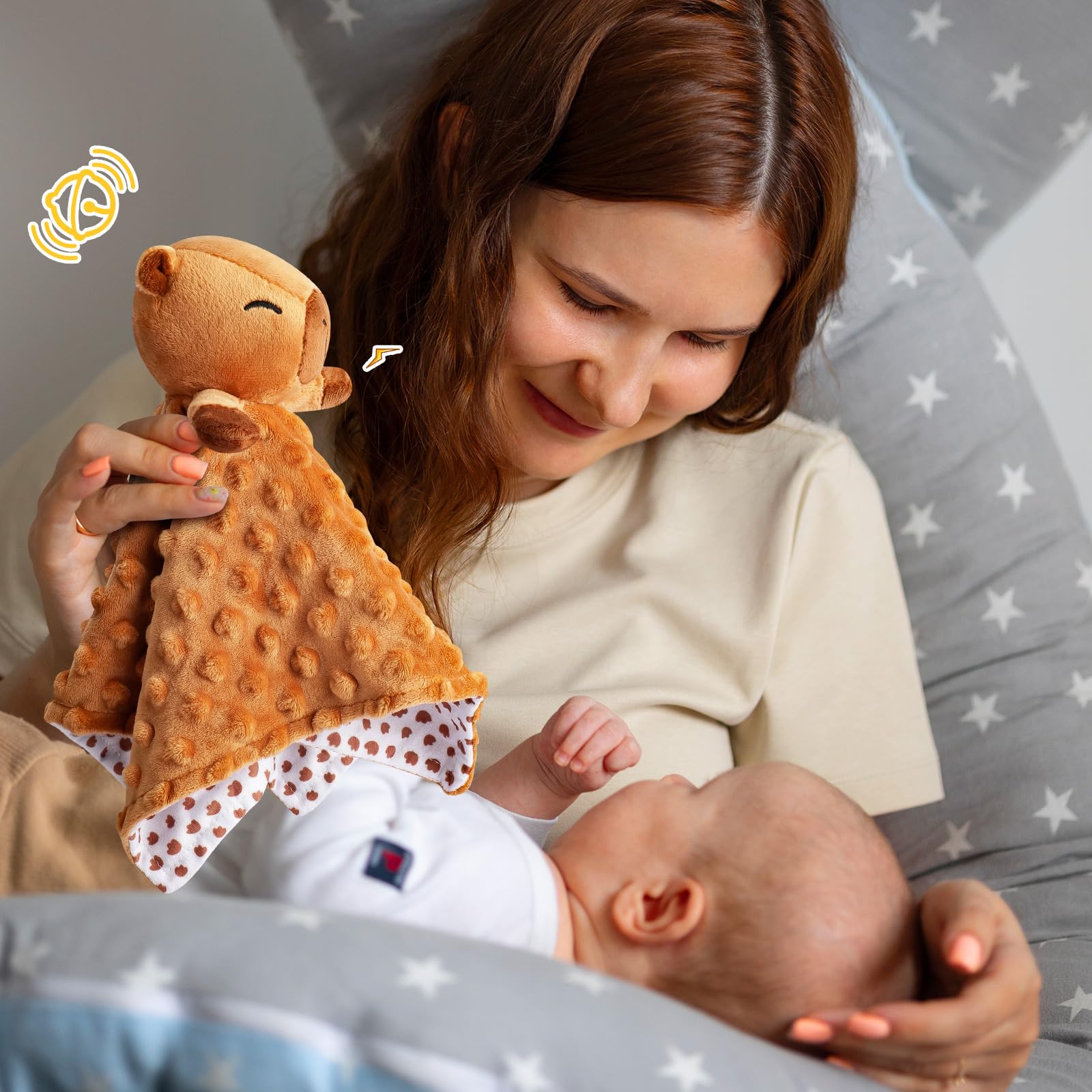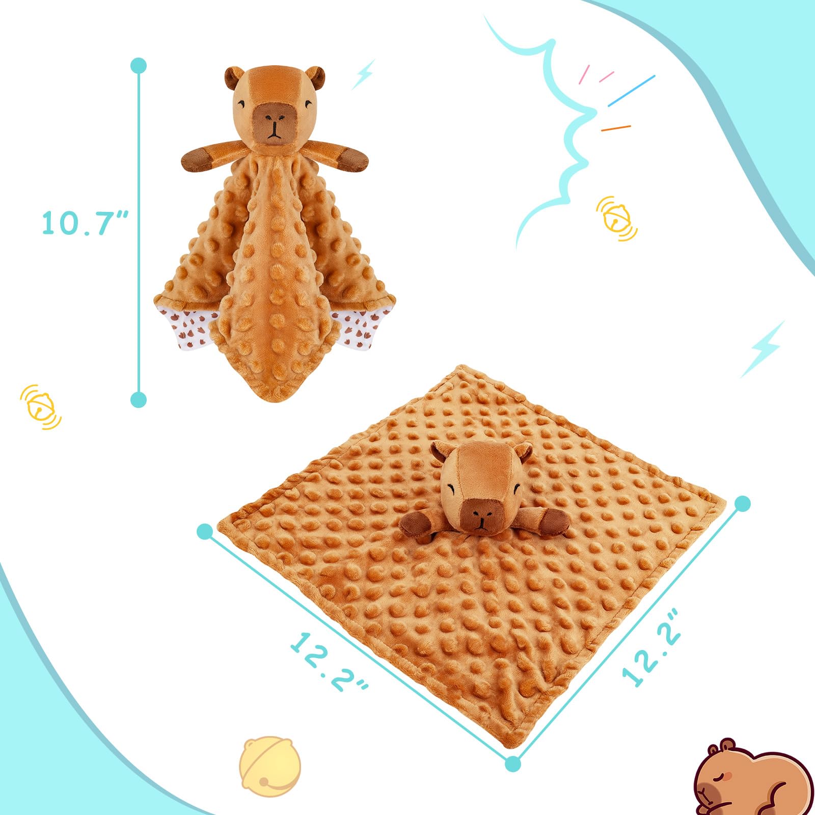 【Multipurpose of Baby Lovey Security Blanket】The capybara's hands are filled with sound paper, which can exercise the baby's touch and grip, arouse the baby's curiosity, and improve the baby's hand flexibility; The bell inside the capybara's head can stimulate the baby's grasp of sound, giving them an initial understanding of sound; For infants, it has both a soothing effect and a companionship effect, which is safe and effective.