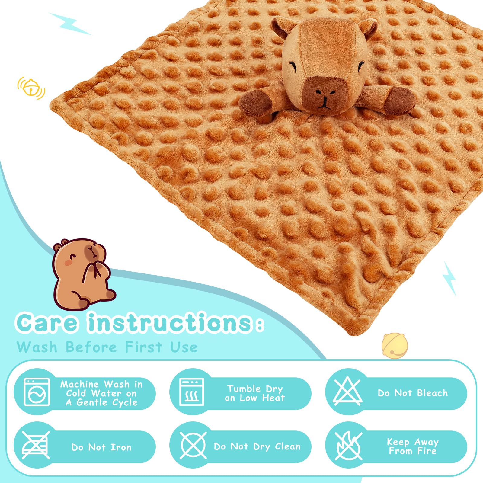 【Precautions for Capybara Blankets】Security Blankets need to be cleaned before first use. They can be gently machine washed or hand washed with cold water, and then dried in a low-temperature dryer or placed in the sun to dry; Remember: Do not bleach, do not iron, do not dry clean, and keep away from sources of fire.