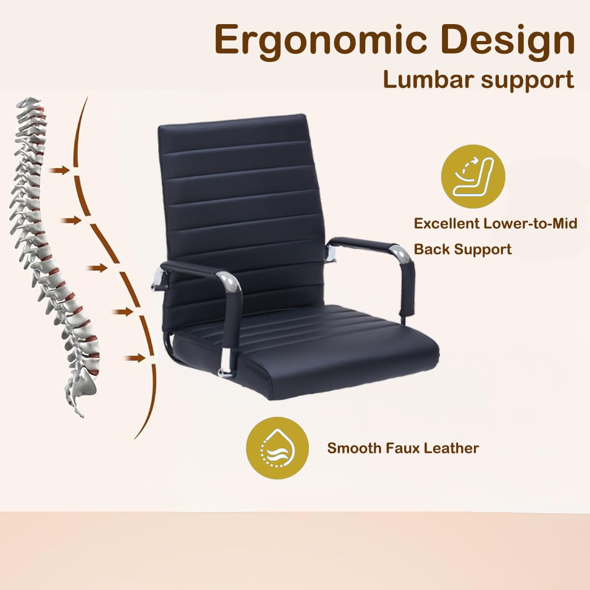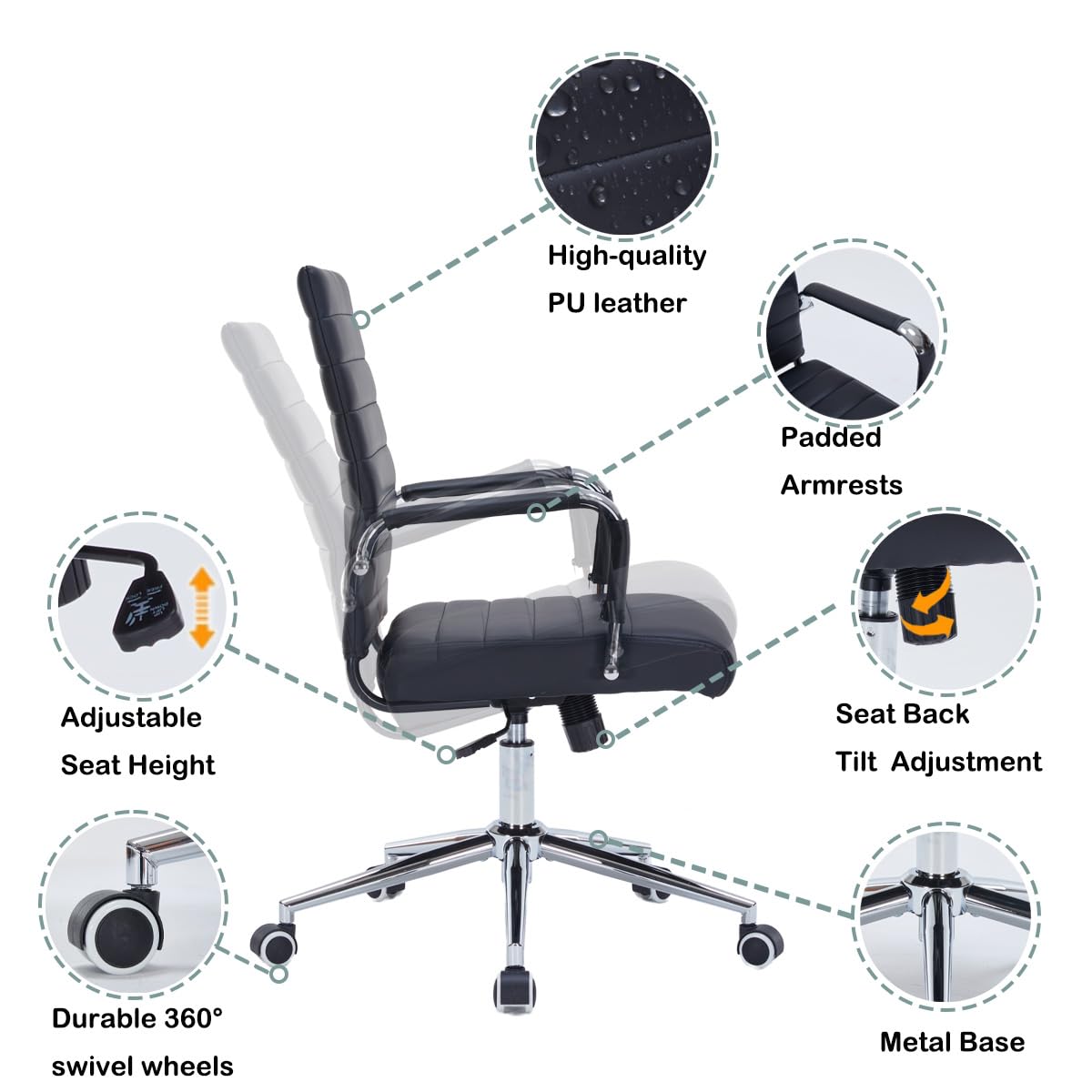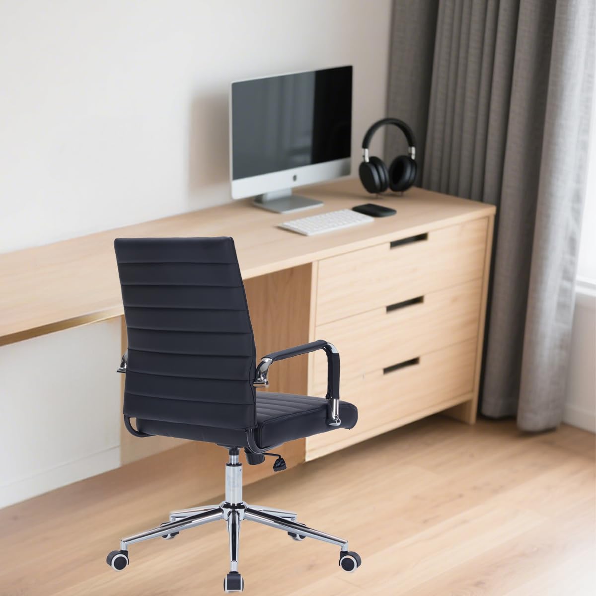 Premium black office chair crafted with PU leather desk chair ribbed upholstery, offering a modern office chair aesthetic that elevates home office desk chairs, conference room chairs, or teacher chair setups.