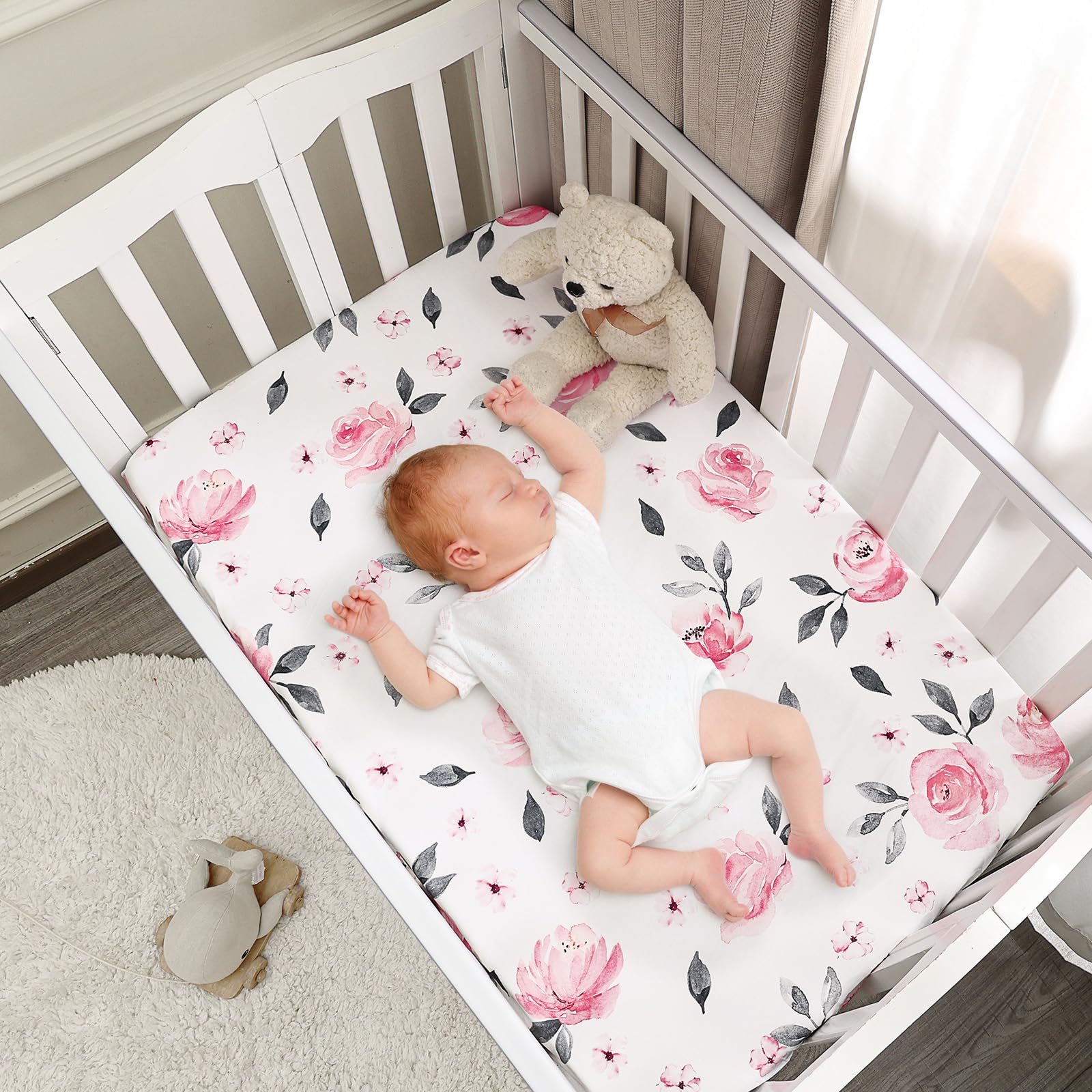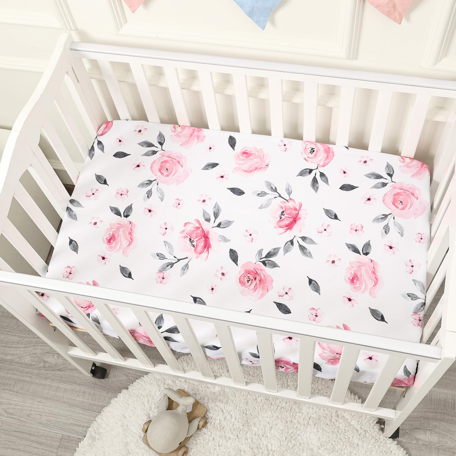 2 Pack Mini Crib Sheets: Pack of 2 mini crib sheets/pack n play sheets are designed with classic, adorable and stylish pink flowers. These sheets are fun without being to childish, they are soft and fit great. With these patterns, you can teach your baby to recognize these flowers.You can use it as your baby photo background, too. I believe, such a background will make your baby more popular.