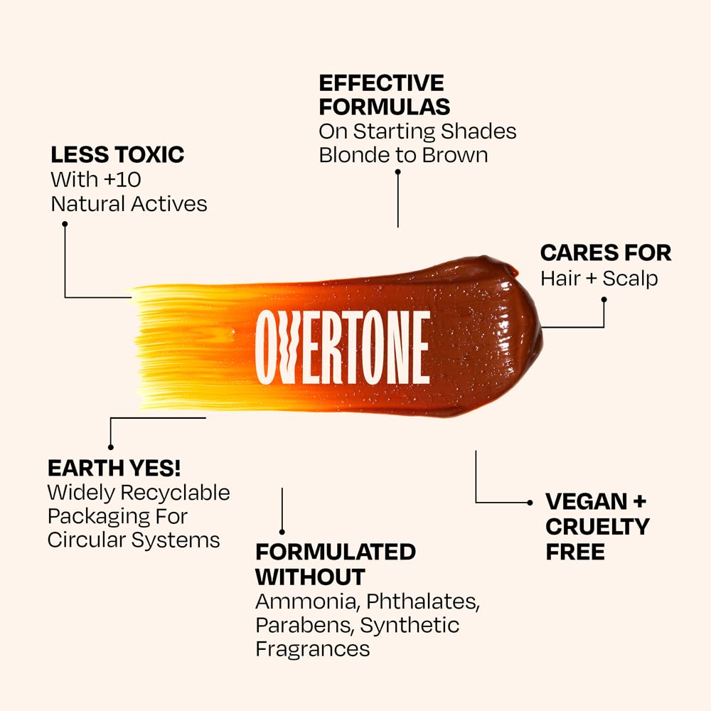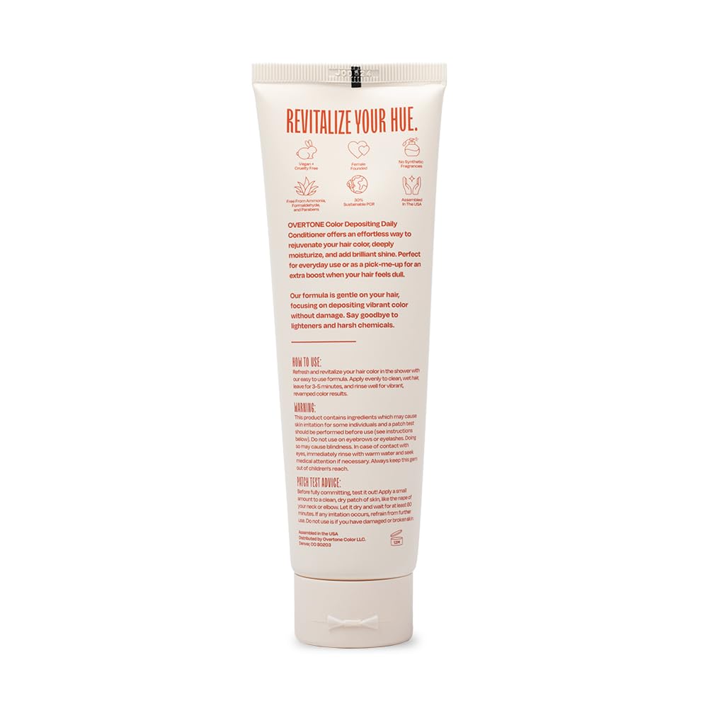 Keep Your Color FreshβEvery Day The Overtone Daily Color Depositing Conditioner is your go-to for maintaining color vibrancy between salon visits. Itβs a temporary pigment refresher designed to tone, hydrate, and enhance shineβall in one easy step. Made with hair-loving ingredients like shea butter, coconut oil, and avocado oil, this lightweight formula conditions deeply while depositing a soft touch of color. Itβs gentle enough for daily use, safe on all hair types and textures, and works best on light to medium shades where color payoff is most visible. Just shampoo, apply the conditioner to wet hair, leave it on for 3β5 minutes, and rinse well. The color lasts up to 5β10 washes and fades gradually without buildup, brassiness, or commitment. Like everything we make, itβs 100% vegan, cruelty-free, and made without sulfates, parabens, and ammonia. Use it as often as you like to keep your color looking freshβor pair it with our Semi-Permanent Color Mask for a more intense refresh.