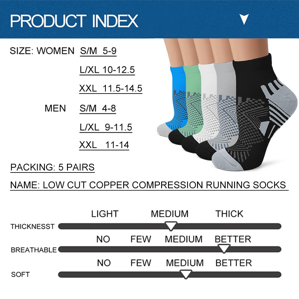 Copper Ankle Compression Socks – Designed with 15-20 mmHg graduated compression, these low cut compression socks help support circulation, ease swelling, and provide lasting comfort for running, work or daily use