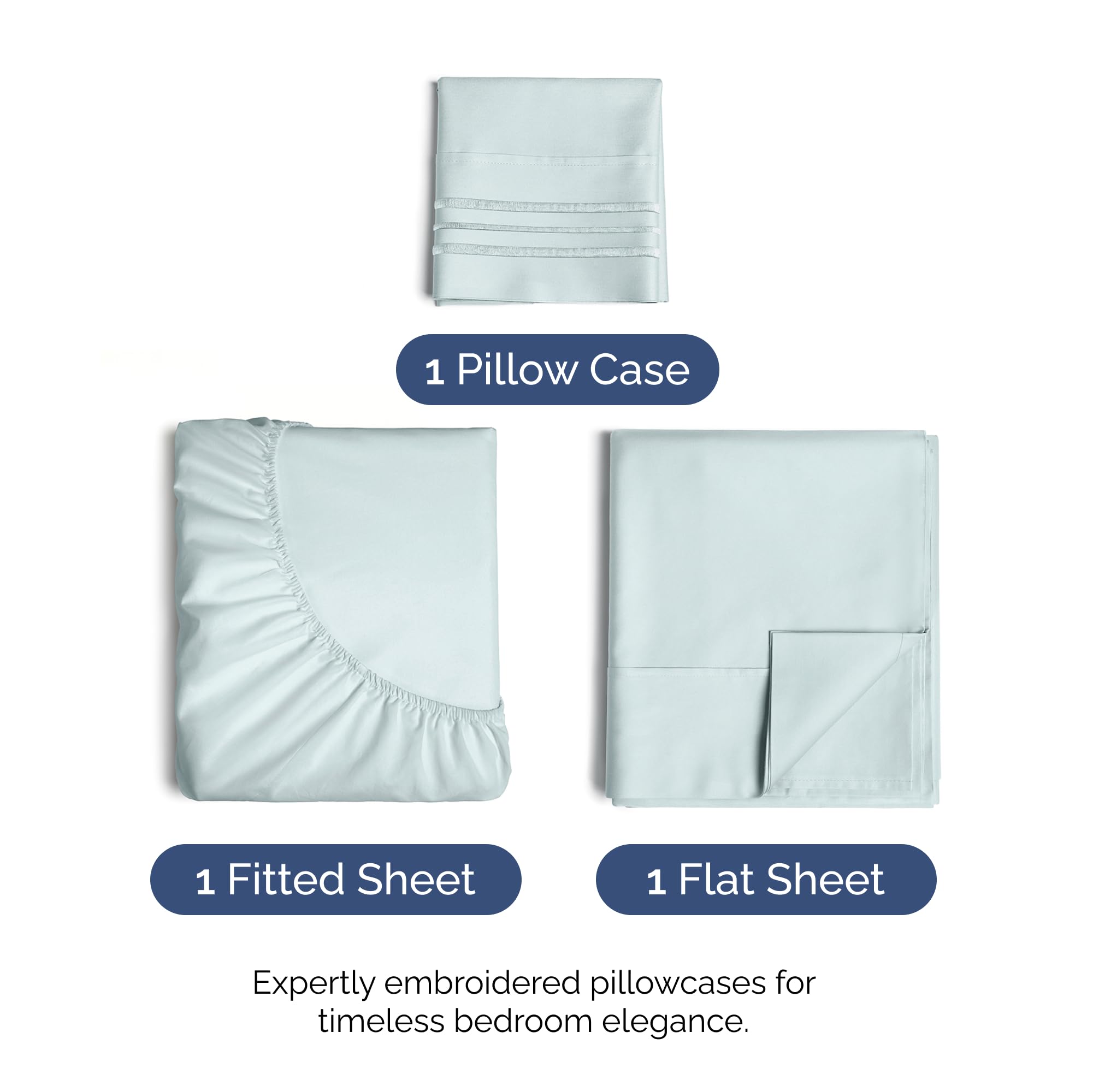 3 PIECE BED SHEET SET: 1 pillow case and flat sheet and fitted sheet. Flat Sheet (96”x 66”) Fitted Sheet (75”x 38”) 1 Pillow Case (20”x 30”) - a comfy upgrade for Adults, Kids, Teens, Boys & Girls.