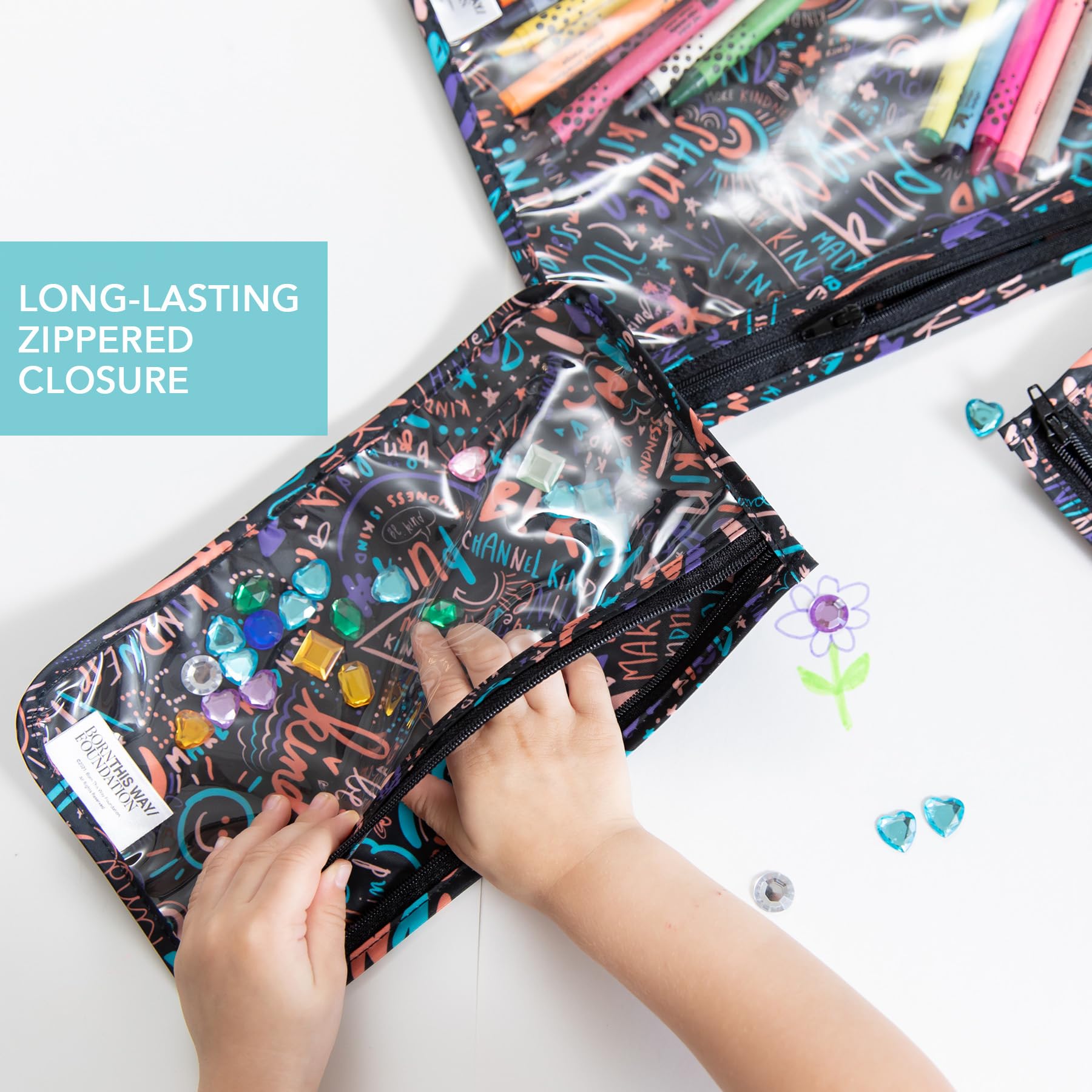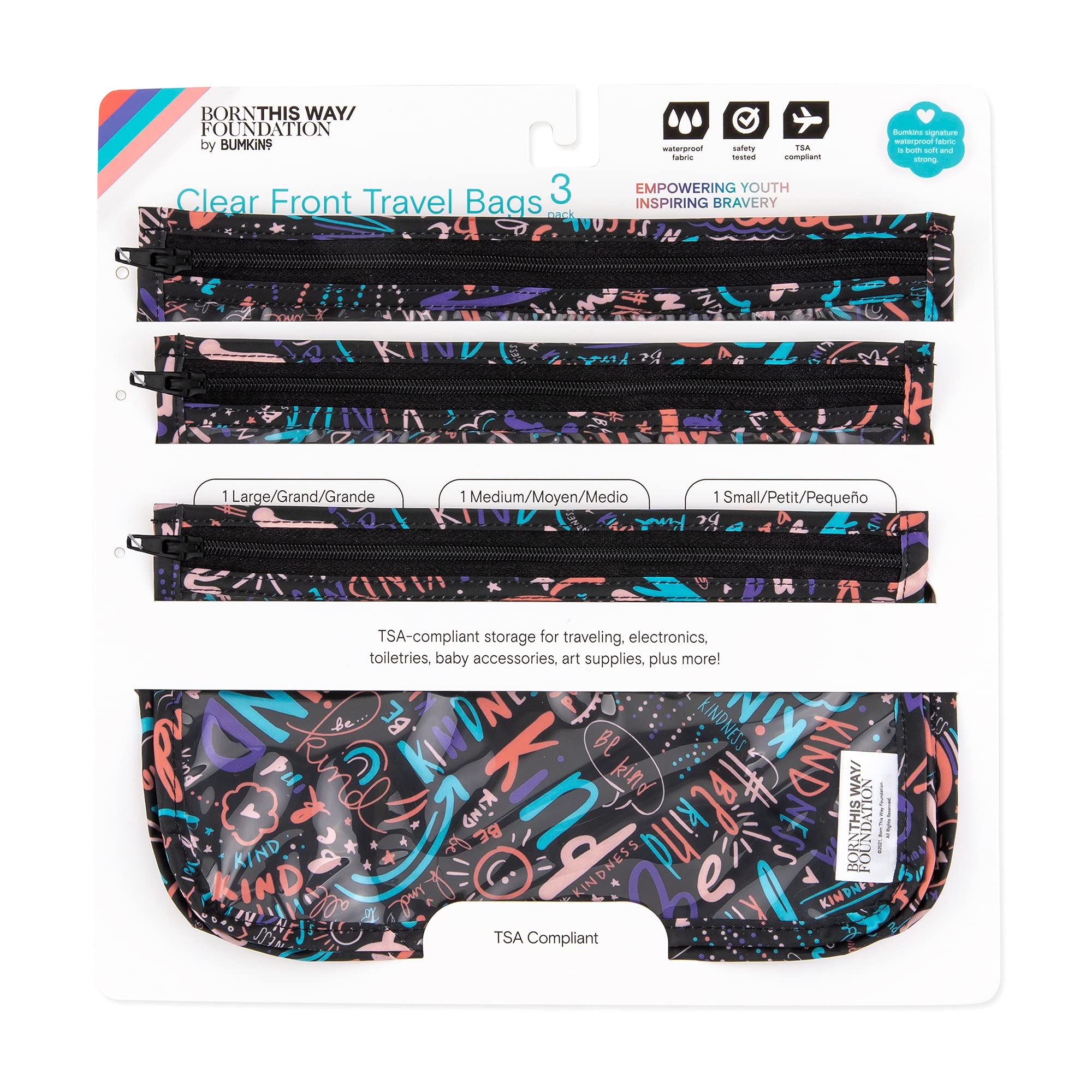 Promote messages of kindness while staying organized! Whether packing for you or your little one, Bumkins Clear Travel Bags make excellent toiletry/travel bags. An alternative to single-use plastic bags, our reusable bags are great organizers for diaper bags, toys, accessories, cosmetics, electronics, and more. The bags are TSA compliant, making it easy to transition from day-to-day use to clearing airport security in your carry-on. Made from Bumkins’ lightweight, durable, waterproof fabric with a clear side. The set includes 3 sizes: large: 9.5"x 8.5"; medium: 9"x7"; small: 9"x5". We use third party labs to ensure the products we manufacture comply with CPSC and CPSIA standards for BPA, Lead, and Phthalates. Born This Way Foundation by Bumkins is a partnership with the goal of promoting kindness and mental health awareness. A portion of each purchase supports Lady Gaga’s non-profit Born This Way Foundation’s mission of supporting youth mental health and working with them to build a kinder, braver world. Together, we can make kindness cool, validate the emotions of young people, and eliminate the stigma surrounding mental health.