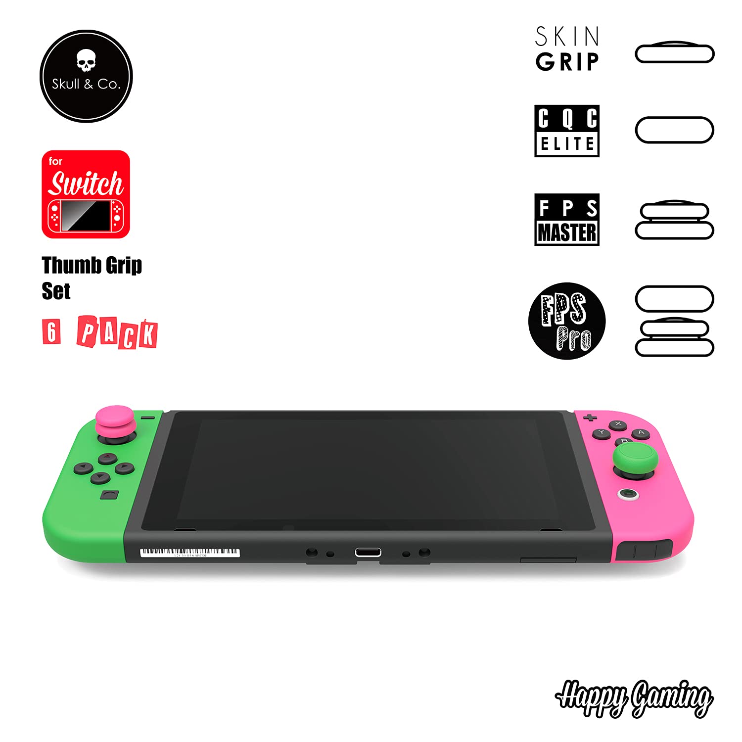 Important Note: 1. The Thumb Grips fit the SWITCH Lite joysticks, but some color transference will occur. We recommend SWITCH Lite users rather use the Lite Gray Thumb Grips . 2. In order to have the best performance, please use dry cloth or tissue to wipe the Thumb Grip before you use. Compatible: for Nintendo Switch Joy-Con ONLY Material: Soft TPE Package Included: 1 Pairs Skin Grip 1 Pairs CQC Elite Thumb Grip 1 Pairs FPS Master Thumb Grip We specifically design 3 different kinds of thumb grips for Nintendo Switch joy-con stick, which not only protect your orignal joystick cap, but also can provide more accurate control feeling. Skin Grip Thickness: 1.5mm Feature: Protect original joy-con stick cap and keep original control feeling and user habit. CQC Elite? Thickness: 3mm Feature: - Concave Design. - Raising a little control accuracy to meet the requirment of control accuracy from gamers. However, please note that it may cause difficulty to press "- Button" and "B Button" for the reason of personal habits and finger size. FPS Master Thickness: 4.5mm Feature: To satisfy the gamers' control requirement on shooting games and some hardcore games. Gamers often focuse on joystick control instead of using "- button" and "B button" in these games. CQC+FPS=FPS Pro If FPS grip is not high enough, you can increase the joystick height by adding CQC and FPS thumb grips together in the package. About Us: If you have any inquries or suggestion, please feel free to contact us by email. Happy Gaming.