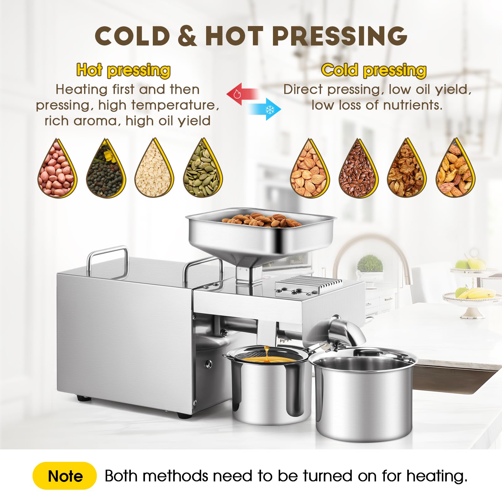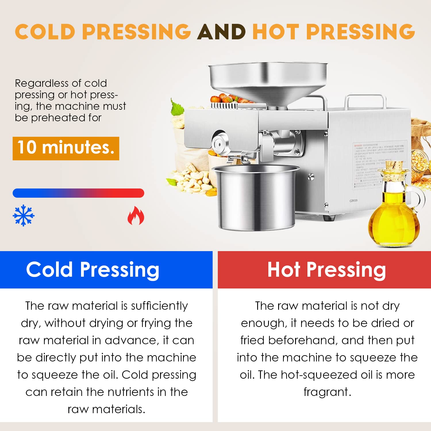 HOT AND COLD PRESS DUAL USE - The whole process of cold pressing is designed for linseed oil,which can fully retain the natural nutrients; Hot pressed oil does not contain water, the oil is more mellow.