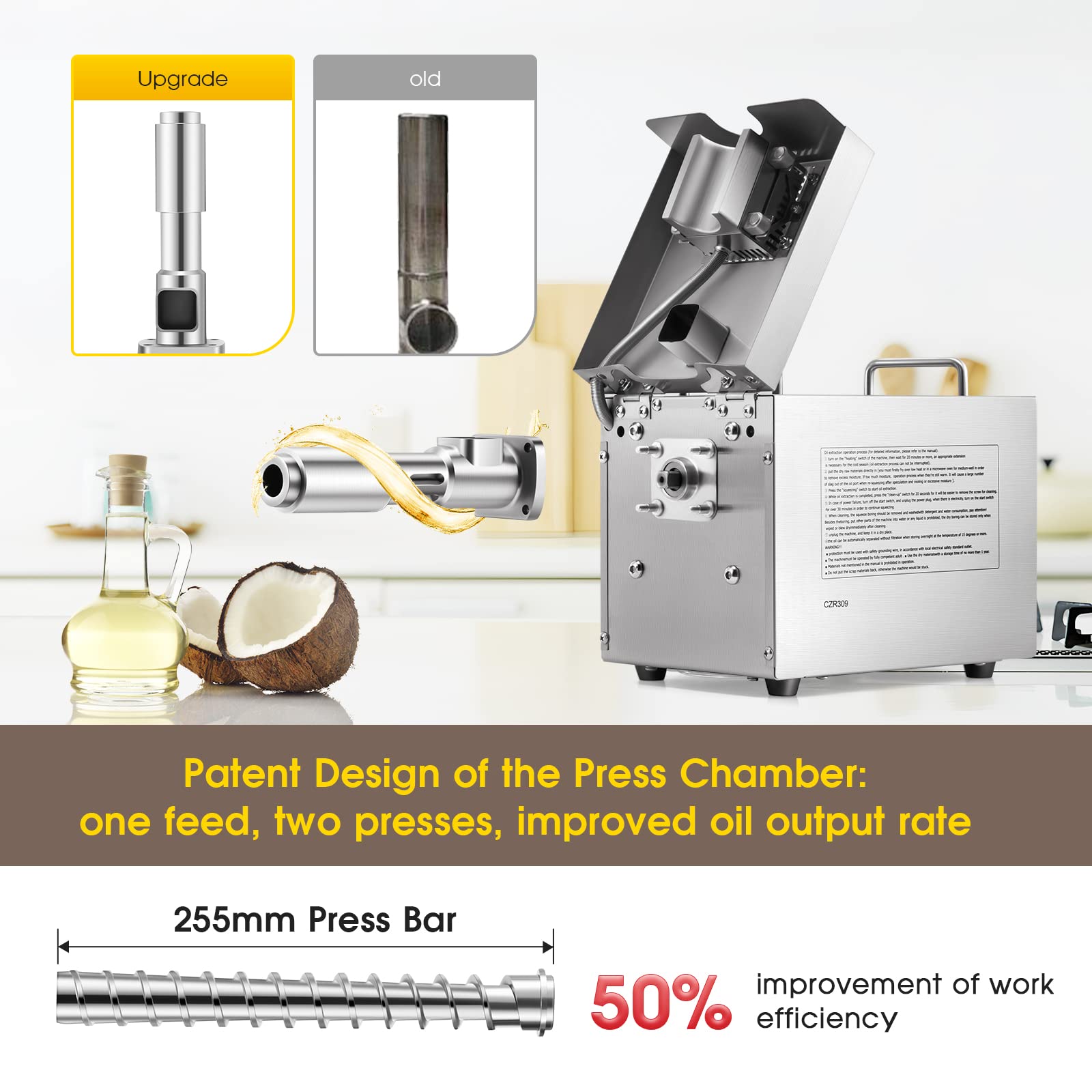 UNIQUE HIGH-SPEED PLASMA PRESSING ROD - The quality of the oil depends on the pressing technology. This press rod is automatically welded by high-speed plasma. The longer the length of the press, the longer time it will be squeezed,the more is the oil yield.