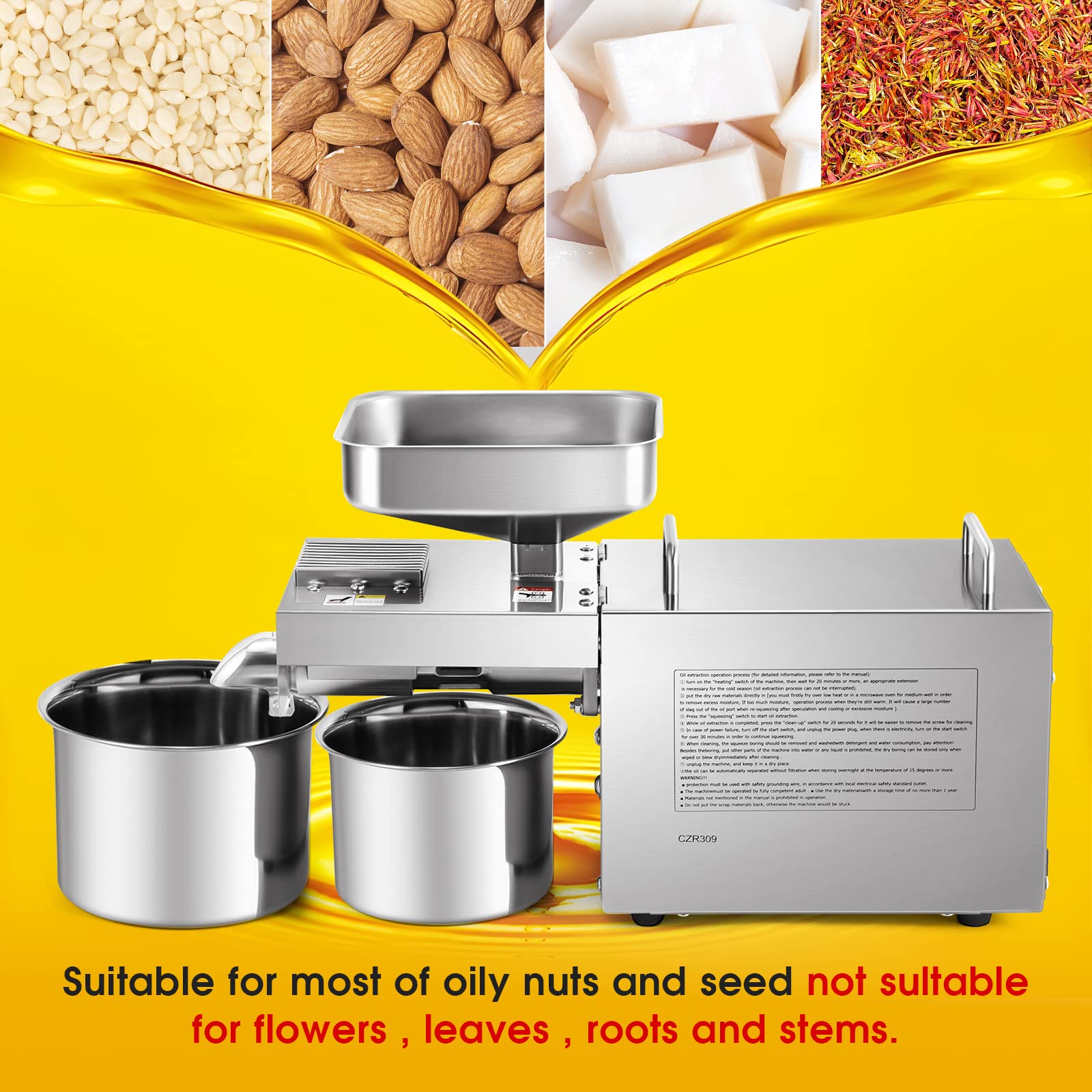 SQUEEZABLE MATERIAL - Varieties of materials including Coconut, Sunflower Seed, Walnut, Okra, Soybean, Peanuts, Moringa Seed, Kiwi Seed, Winged Oil Fruit, Perilla Seed, Flax Seed, Camellia Seed, Rapeseed, Black Sesame, White Sesame, Almond Powder, Pepper Seeds, Pumpkin Seeds, Pine Nuts, Licorice, etc. The machine can't squeeze olive oil, because for household press, it is difficult to complete, so we feel sorry that pressing olive oil is not recommended.