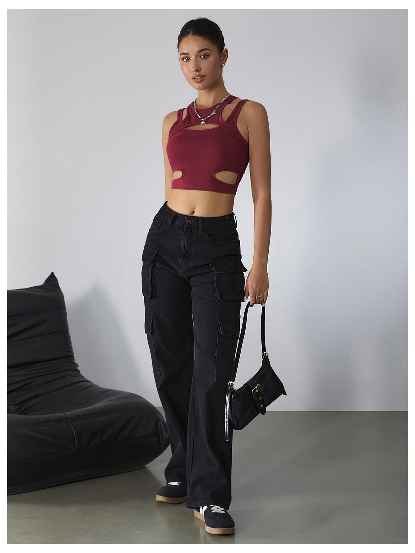 Match: You can pair this cut out tank top with high waisted pants, jeans, cargo pants or skirts for a chic look