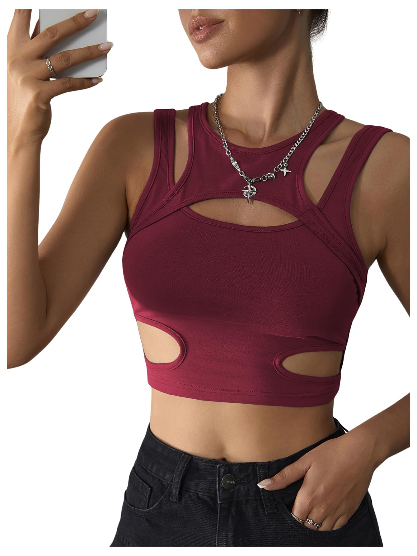 Feature: Cut Out, Sleeveless, Round Neck, Slim Fitted, Plain, Cropped Length, Trendy Tank Tops for Women