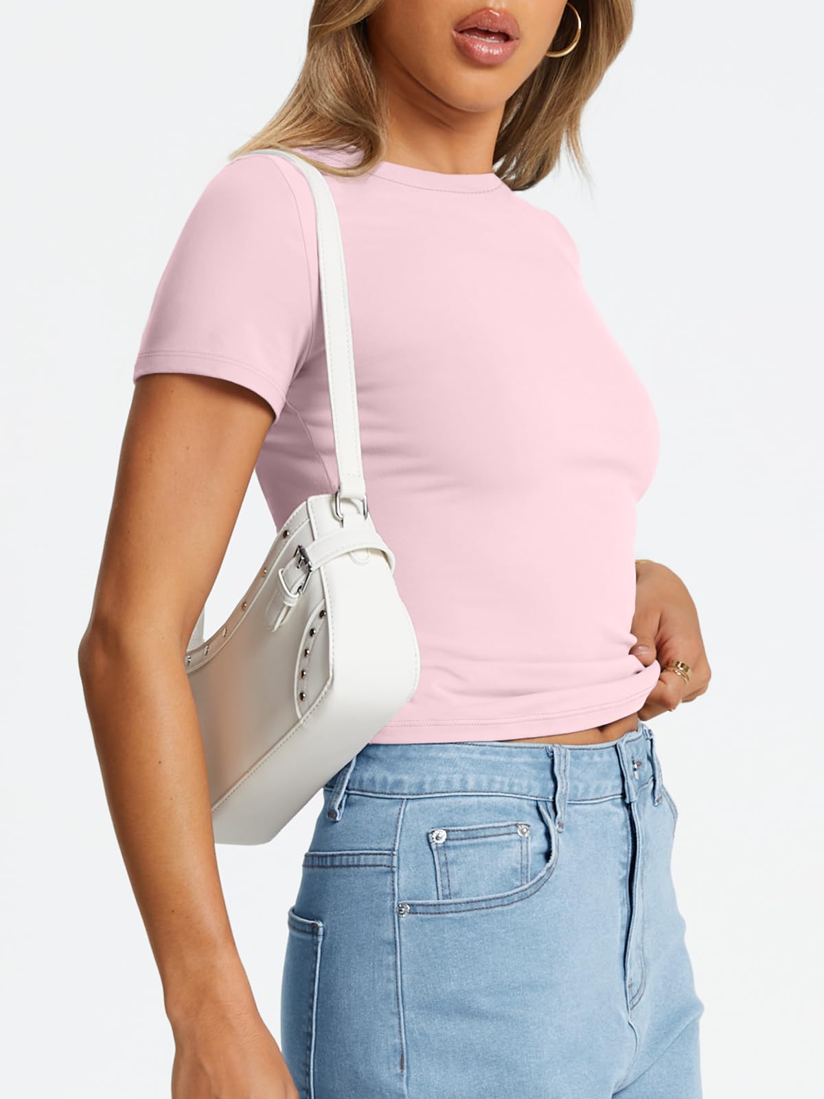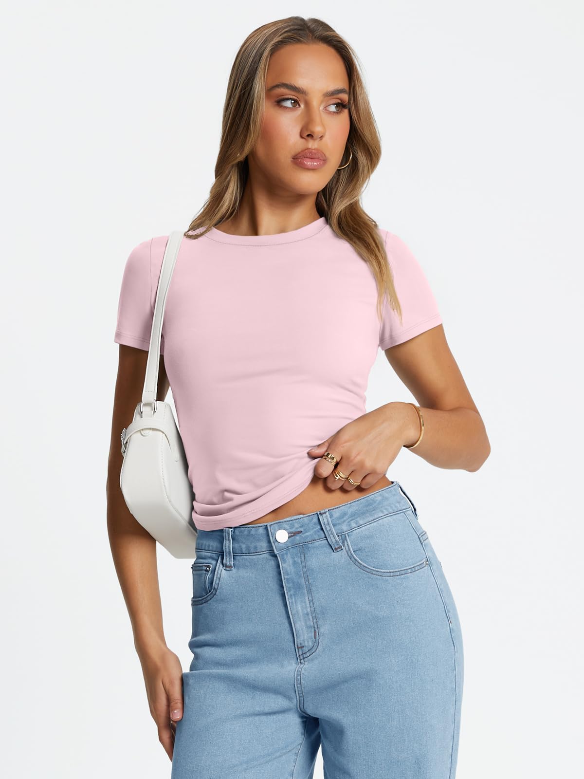 Design: This top features a cute, slim-fitted, and casual style with a crew neck and short sleeves. It comes in both cropped and regular styles, giving you the option to wear it as a regular top or fold it up for a trendy crop top look