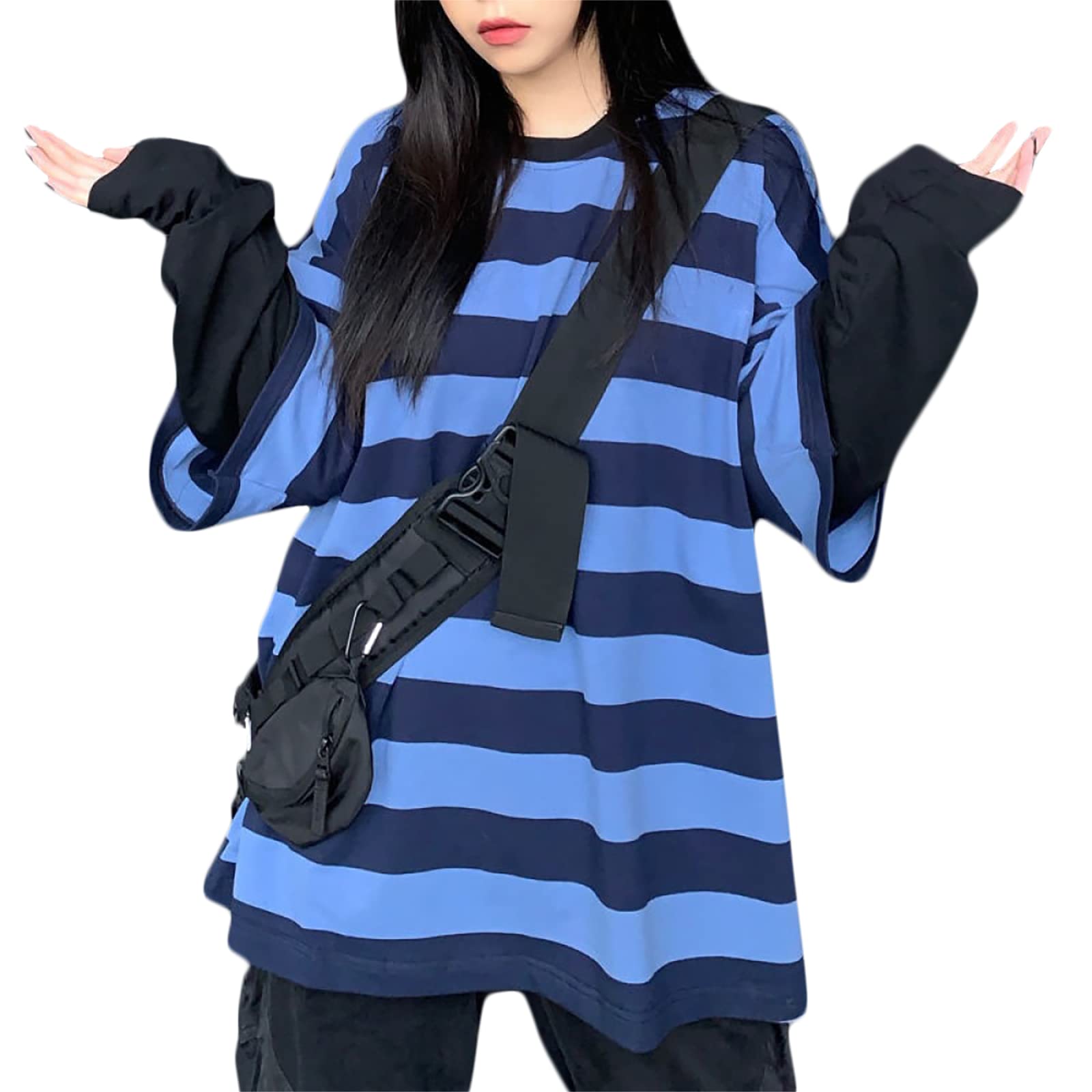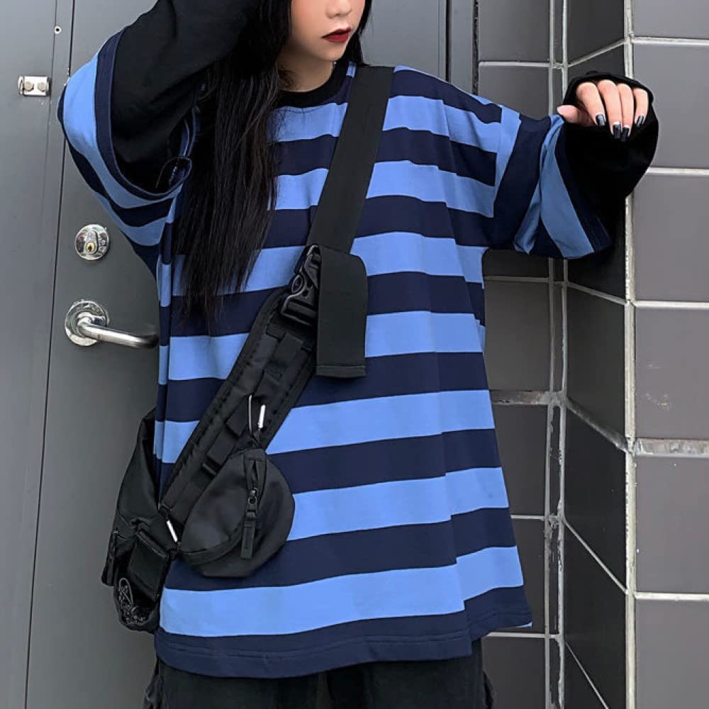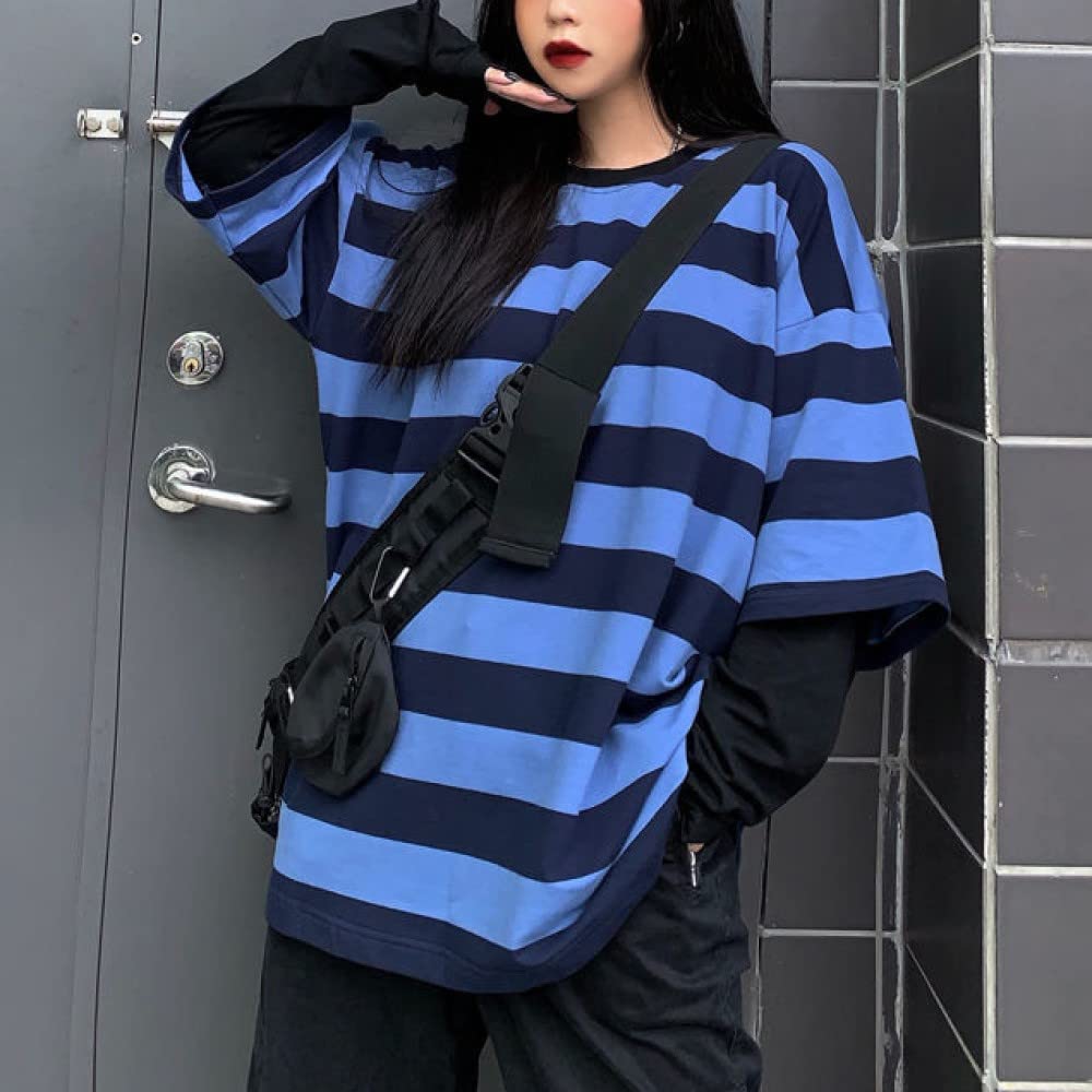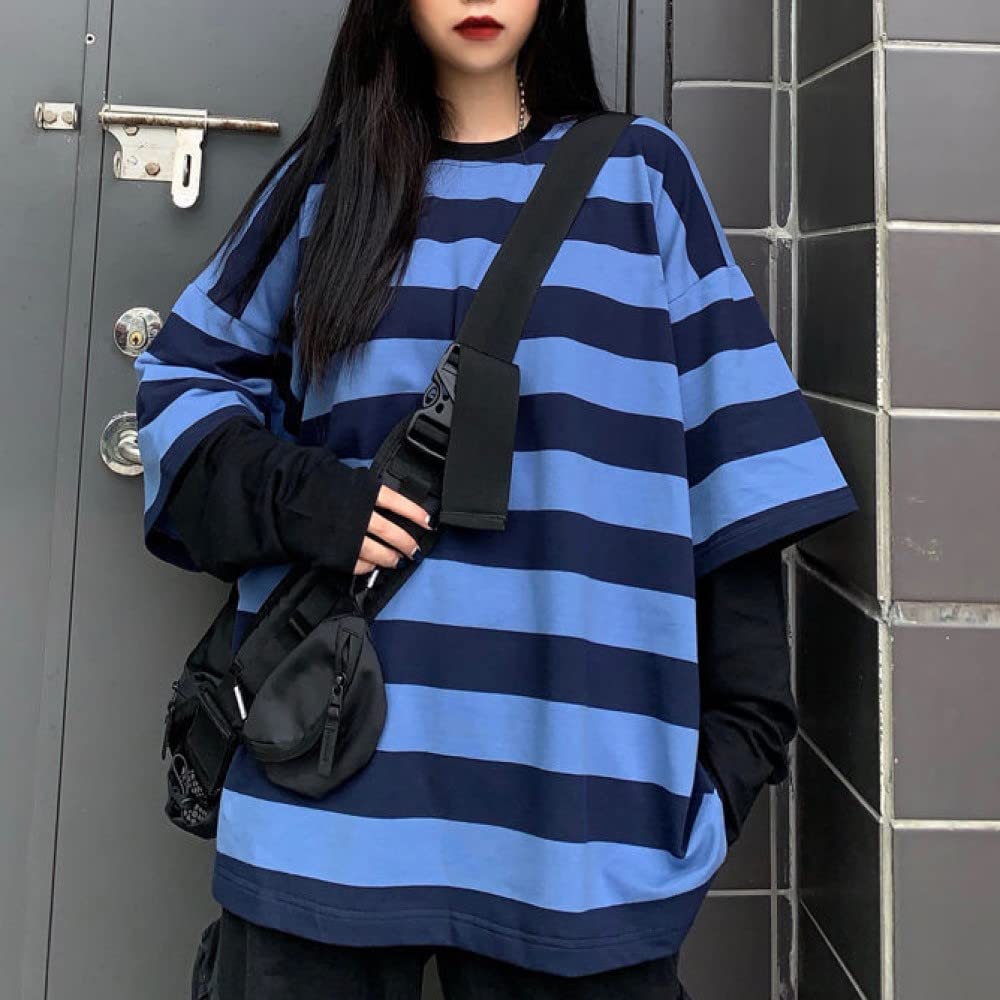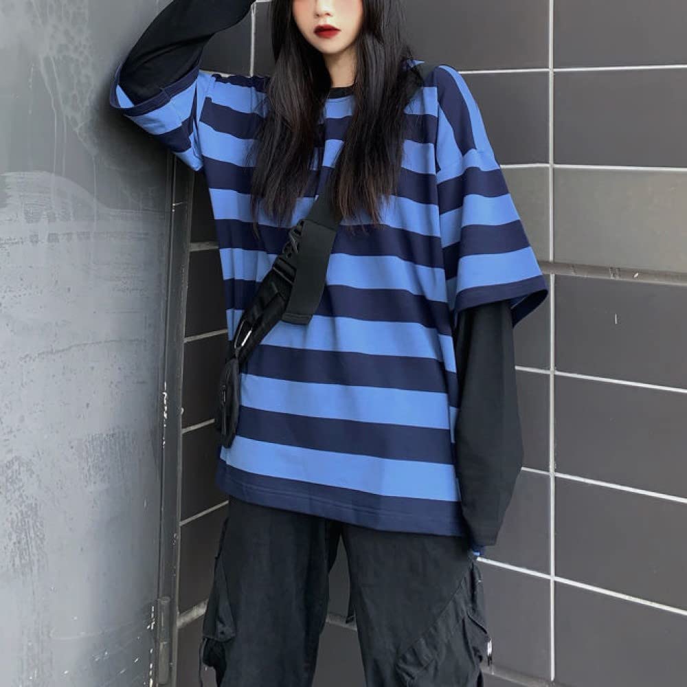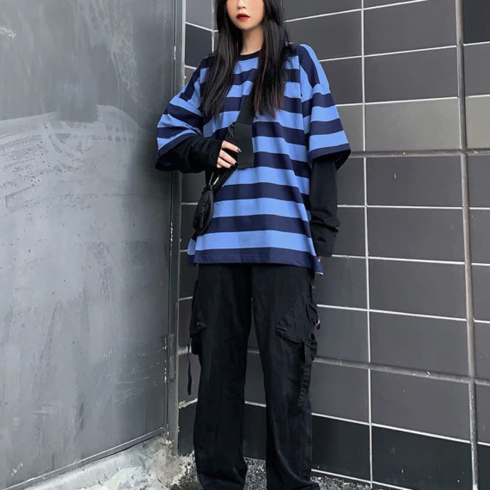 Features: This gothic pullover is designed with a round neck, stripes, long sleeves, fake two-piece design, casual loose, urban style, hip-hop style, fashionable style, unisex top, suitable for men and women.