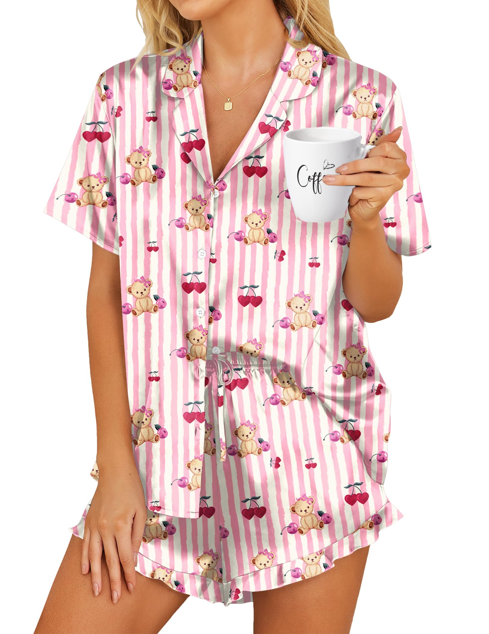 【Unique Fashion Designed】: 2 Piece Satin Pajama Set Featuring Relaxed Style, Short Sleeve, Classic Notch Collar, Full Button Design is easy to put on and take off. Cute Print Pj Set With Elastic Waist Contrast Trim Pajama Shorts will give you more comfortable and freendom feeling when you wear it.
