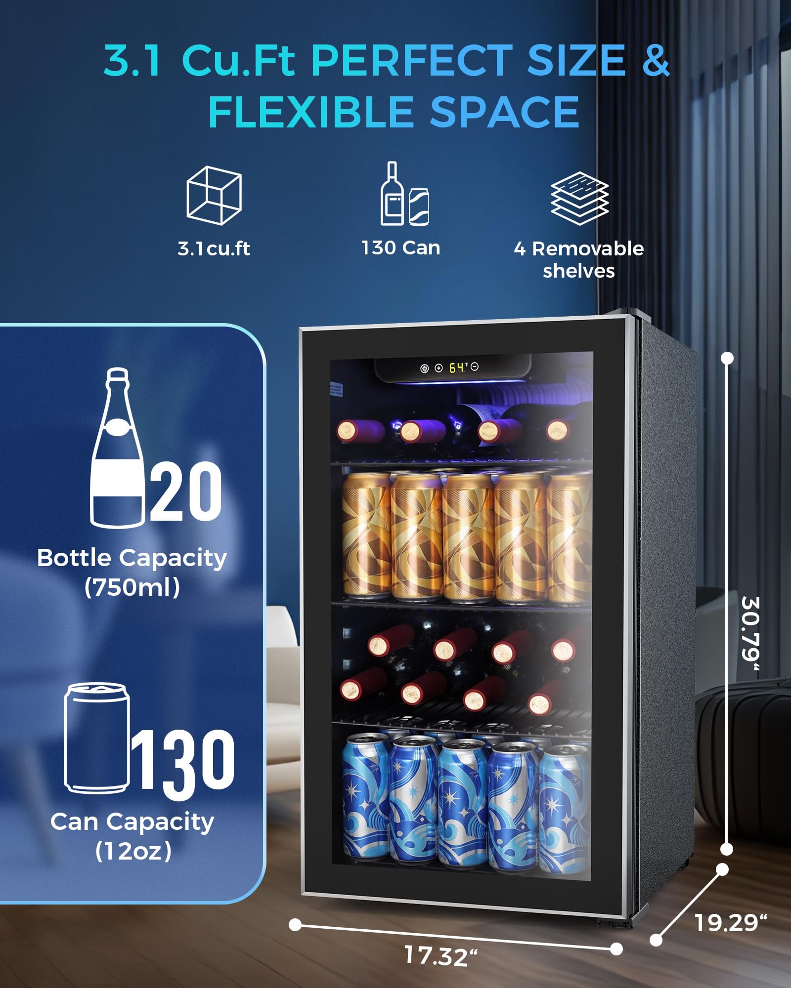 Built-In/Freestanding Beverage Refrigerator - 3.1 Cu.Ft / 130-Can Capacity. Maximize your storage without sacrificing space! Perfect for stocking beer, soda, bottled water, and even wine bottles. The 4 adjustable wire racks let you customize the interior layout for different-sized drinks, while built-in LED lighting makes it easy to find your favorite beverage in the dark, even at night parties.