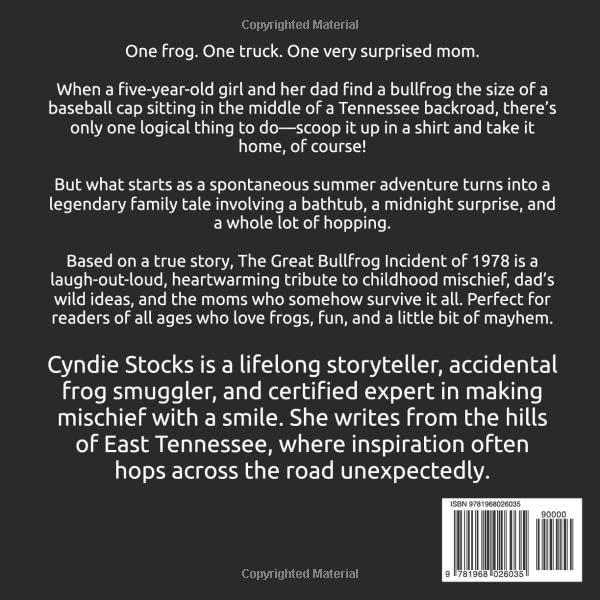 One frog. One truck. One very surprised mom. When a five-year-old girl and her dad find a bullfrog the size of a baseball cap sitting in the middle of a Tennessee backroad, thereβs only one logical thing to doβscoop it up in a shirt and take it home, of course! But what starts as a spontaneous summer adventure turns into a legendary family tale involving a bathtub, a midnight surprise, and a whole lot of hopping. Based on a true story, The Great Bullfrog Incident of 1978 is a laugh-out-loud, heartwarming tribute to childhood mischief, dadβs wild ideas, and the moms who somehow survive it all. Perfect for readers of all ages who love frogs, fun, and a little bit of mayhem.