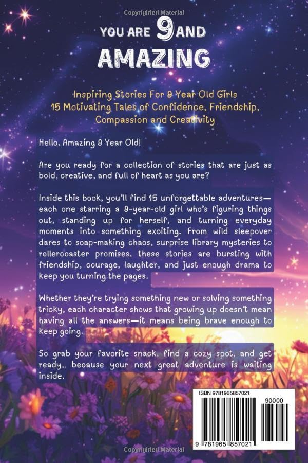 Help your 9-year-old daughter build confidence, creativity, and courage—one unforgettable story at a time. At nine, the world starts to feel a little bigger—and so do the questions, the friendships, and the emotions that come with growing up. Maybe your daughter feels unsure about speaking up, left out of a group text, or nervous about trying something new. Maybe she’s learning that friendship isn’t always simple or that sometimes, the biggest challenge is believing in herself. You can’t walk every hallway with her. But you can give her the tools to handle whatever comes her way. And this book is the perfect place to start. With 15 heart-filled, humorous, and high-energy stories, You Are 9 And Amazing! invites your child into a world where girls just like her take on wild dares, build their own businesses, create glitterless fashion protests, and stumble into mysteries, mischief, and the occasional marshmallow mess. Each story holds a subtle life lesson tucked inside a thrilling adventure—no heavy lectures, just moments of growth disguised as fun. Along the way, she’ll meet girls who learn to lead with kindness, say “no” with confidence, laugh at their mistakes, and speak up when it matters most. Here’s what she’ll discover inside: Characters who mess up, get up, and keep going—with heart and humor School mishaps, epic sleepovers, rollercoaster-sized promises, and business blunders that turn into bonding moments Bite-sized life lessons about self-expression, compromise, bravery, and bouncing back A cast of creative, funny, relatable girls she’ll see herself in—and be inspired by An invitation to be bold, be kind, and be her Whether she’s reading solo or you’re sharing stories before bed, this collection turns everyday moments into powerful messages—and makes growing up a little less overwhelming and a lot more fun. Because now that she’s 9, she’s not just learning about the world—she’s starting to shape it. If you want your daughter to grow more confident with every page, scroll up and click “Add to Cart” now. The adventures—and the smiles—are just getting started.