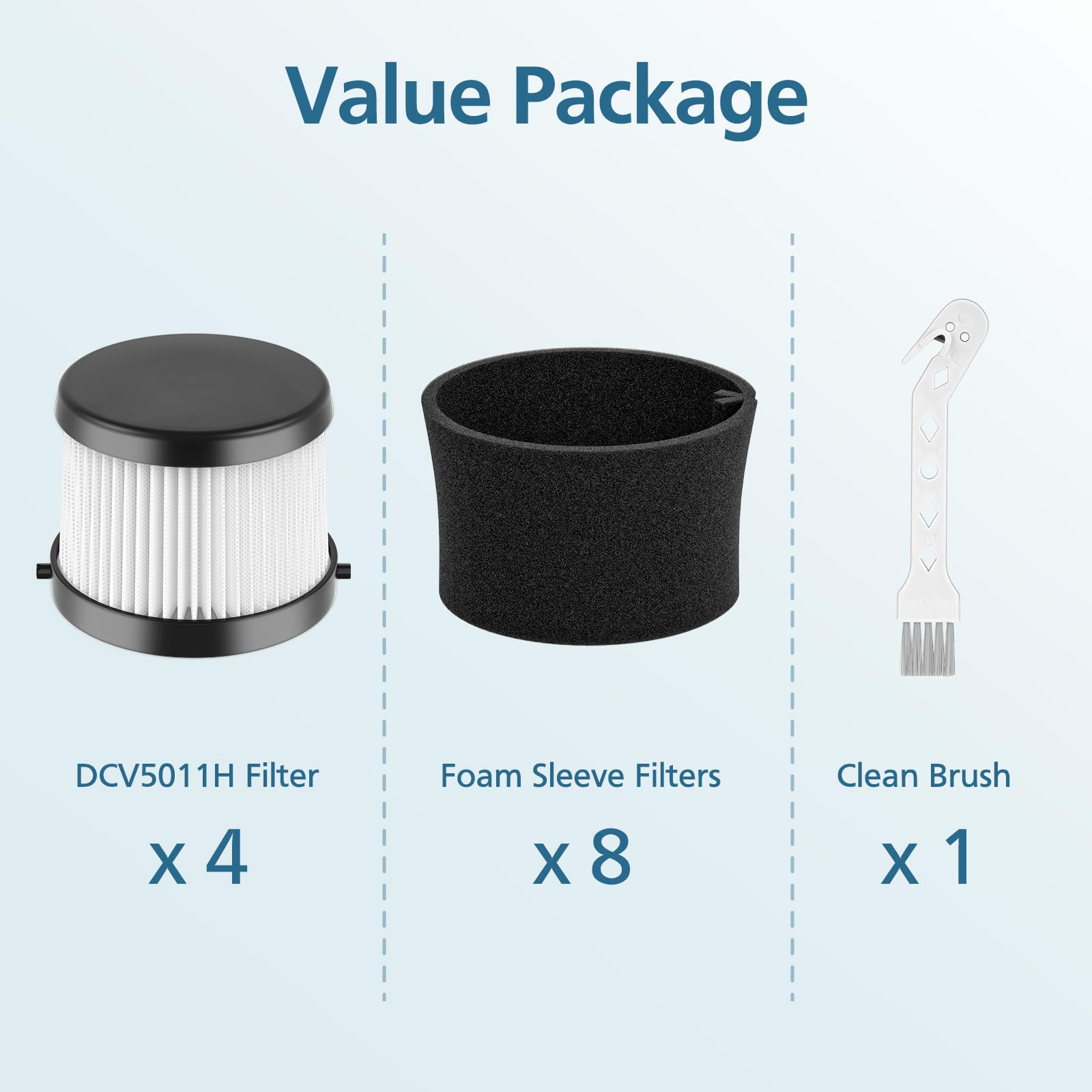 【Value Package】Our DCV5011H Filter Made of Premium Materials. Include 4 pack DCV5011H hepa vacuum filter, 8 pack foam sleeve filters & 1 brush.