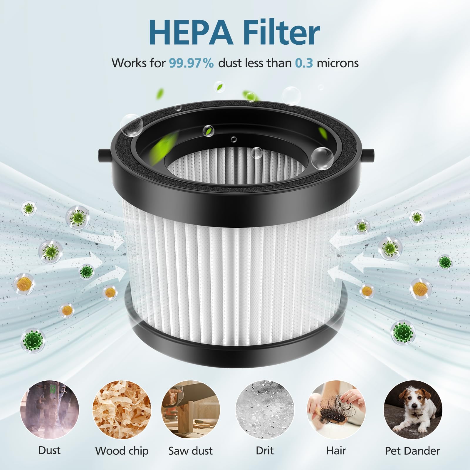 【High Efficient Filtering】DCV5011H vacuum filter is made of pleated filter paper, works for 99.97% of particles as small as 0.3 microns such as dust, dirt, wood chip, small particles, fine powder, and sawdust; folding filter paper provides a larger surface area to improve airflow.
