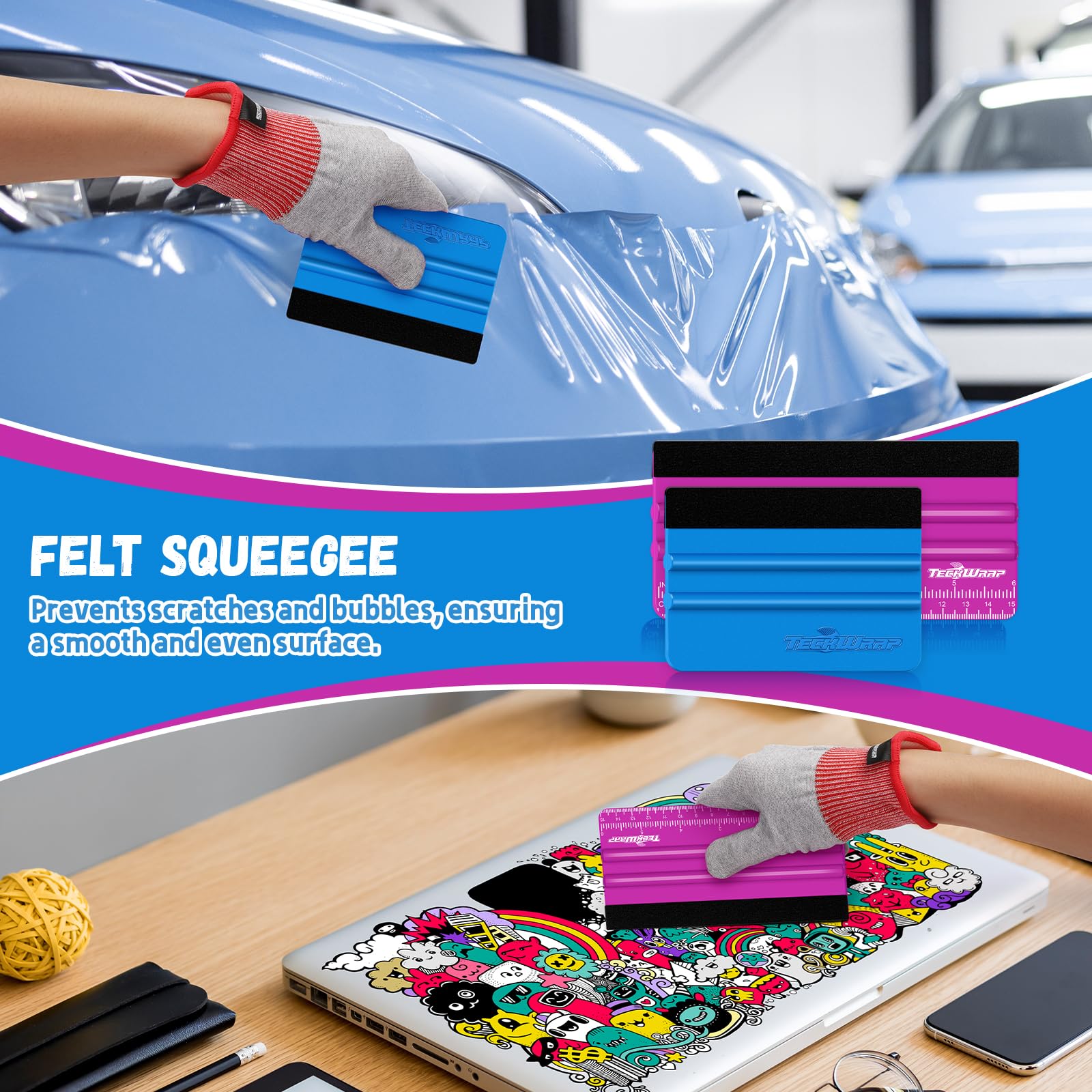 VERSATILE SMOOTHING TOOL: TECKWRAP plastic squeegee tool for vinyl is a widely used multi-purpose tool, ideal for adhesive vinyl, overlay laminate vinyl, inkjet paper, window film, snow removal from vehicles, and car decals. Whether for home DIY projects or professional work, this felt squeegee is an essential tool you can't do without.