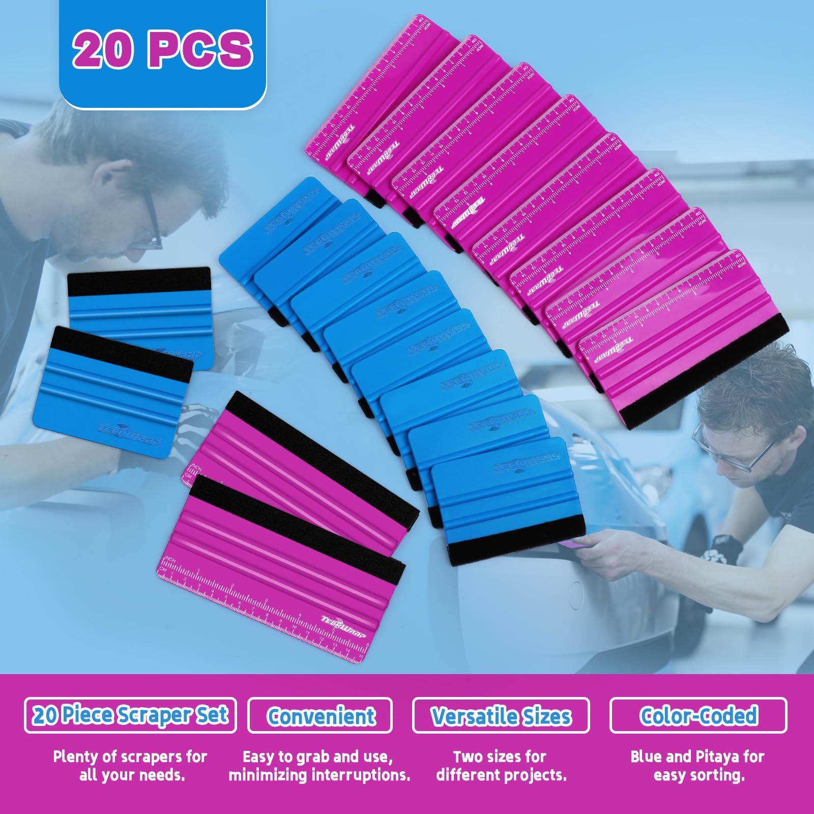 MULTIPLE SIZE OPTIONS TO MEET DIVERSE NEEDS: The set includes two scraper sizes: 10 blue felt squeegee (3.93" x 2.95") and 10 pitaya felt squeegee (6" x 2.9"), each equipped with a corresponding micro fabric felt (20 pieces in total). These vinyl squeegee tool are suitable for handling large surfaces and smaller flat materials, providing flexible options for various projects to meet all your needs.