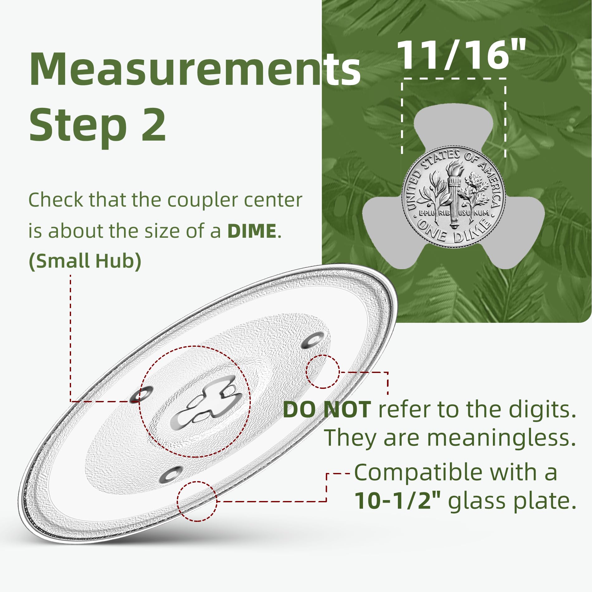 This 10.5 IN Microwave Glass Turntable has a one-dime sized small coupler hole in the center. (The center spot of turntable coupler measures 11/16" in diameter)