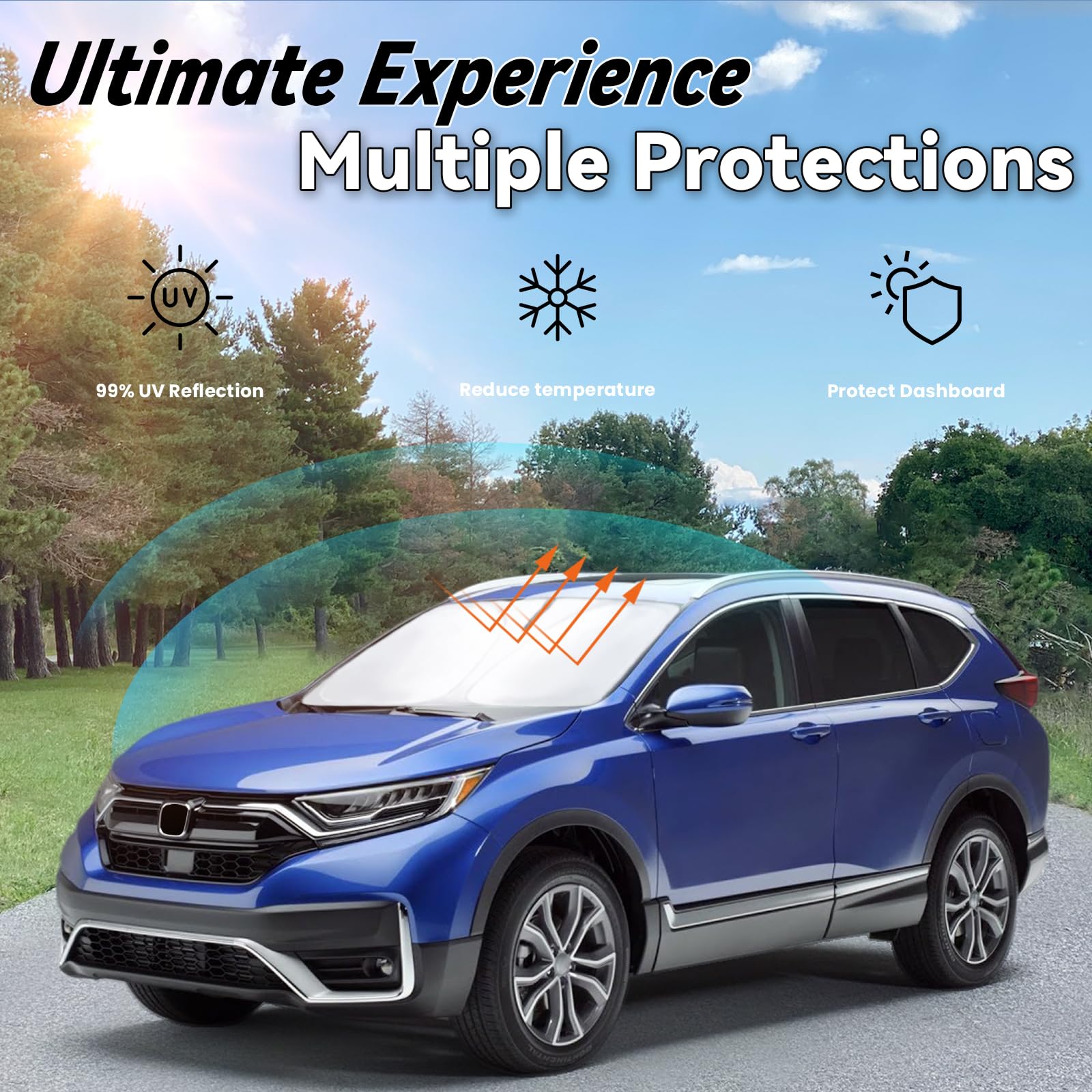 [Stay Cool and Reflect Sun] Crafted from high-density 240T polyester and a blackout coating, this windshield sun shade effectively reflects 99% of UV rays and sunlight to block heat while your car is parked; It shields your interior from intense heat, helping to prevent damage and maintain a more stable temperature.
