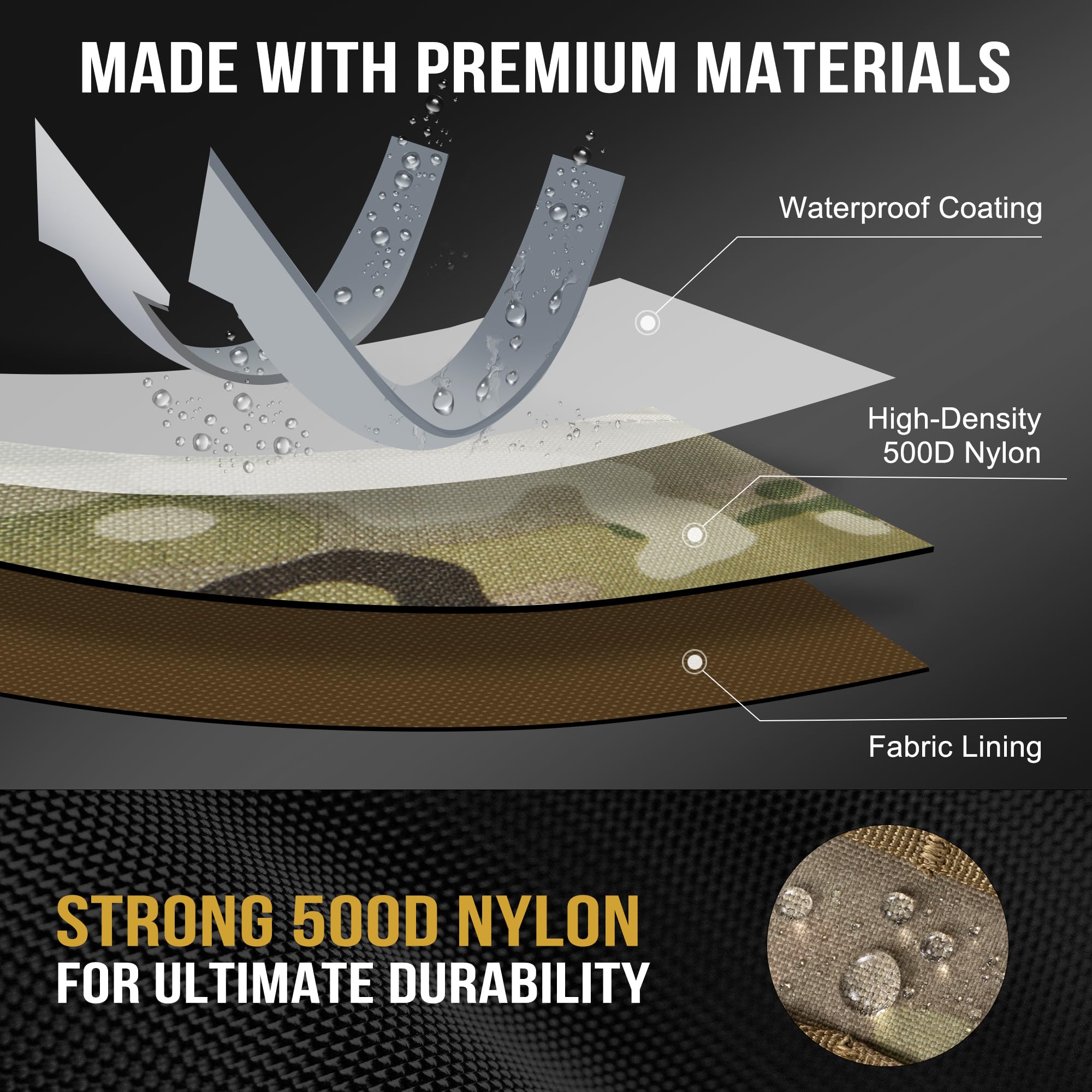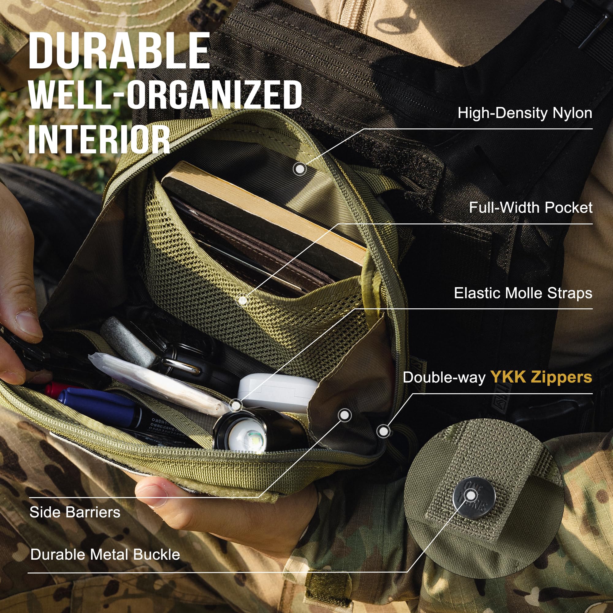 PREMINU QUALITY ZIPPERS&WATERPROOF: The outside of the molle pouch is made of 500D Cordura Nylon for extra reliability. Inside of the molle pouch is made of water-resistant coating with double stitching, closed by double zippers, prevent your admin pouch getting wet in damp environment.