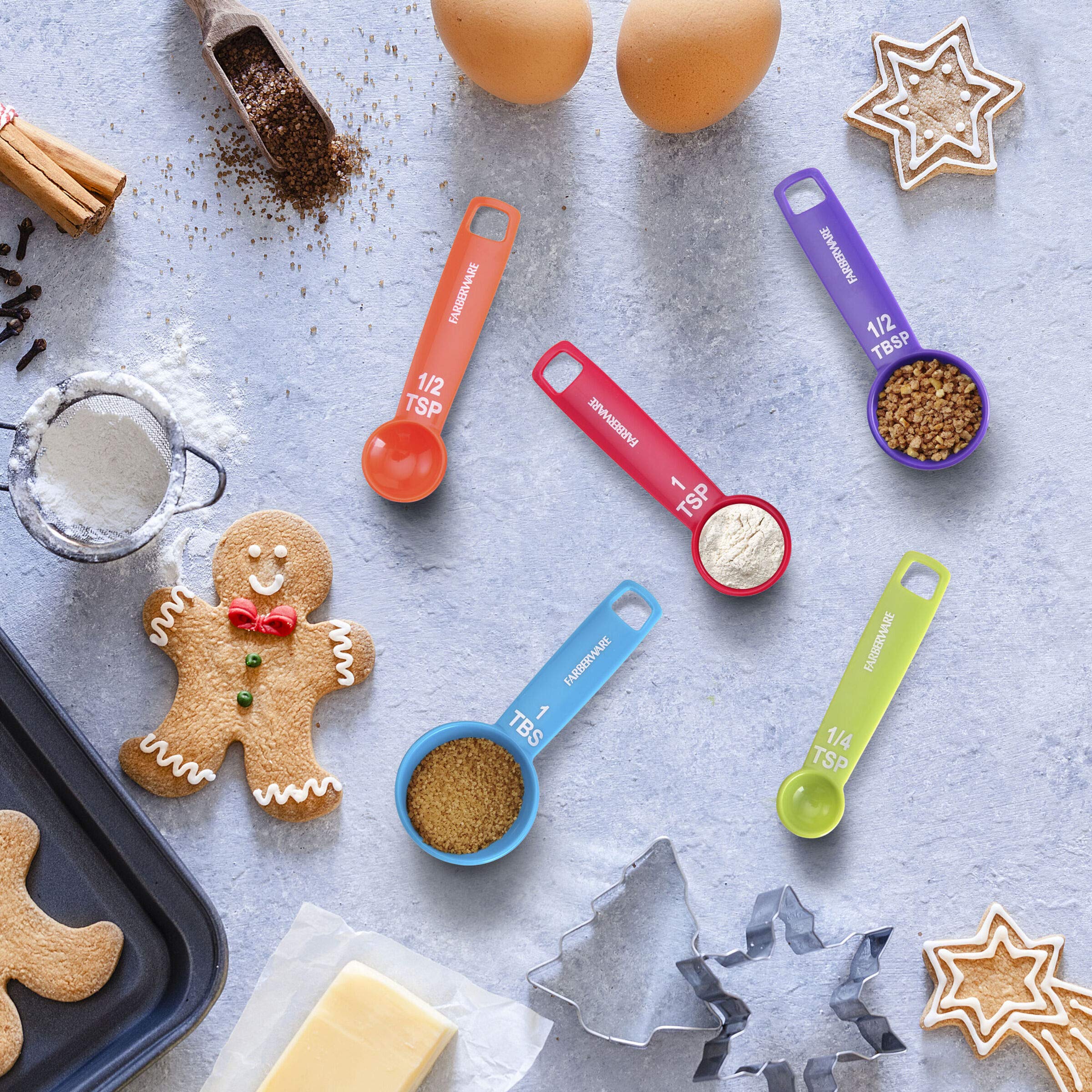 This Farberware Measuring Spoon Set in assorted colors is a necessity for your cooking and baking needs. Come in measurements of 1/4 teaspoon 1/2 teaspoon, 1 teaspoon, 1/2 Tablespoon and 1 Tablespoon increments. Provides accurate measurements and are dishwasher safe.