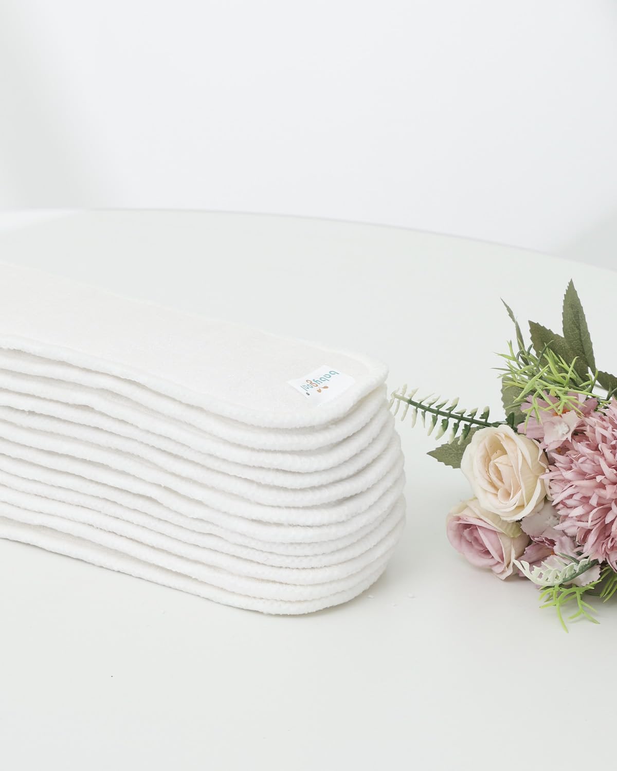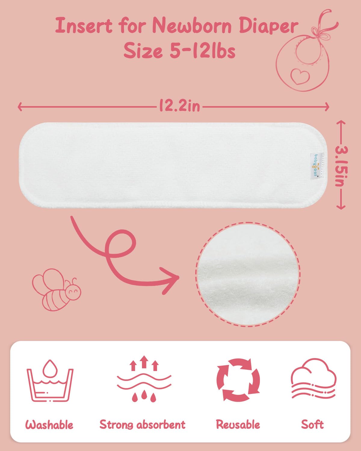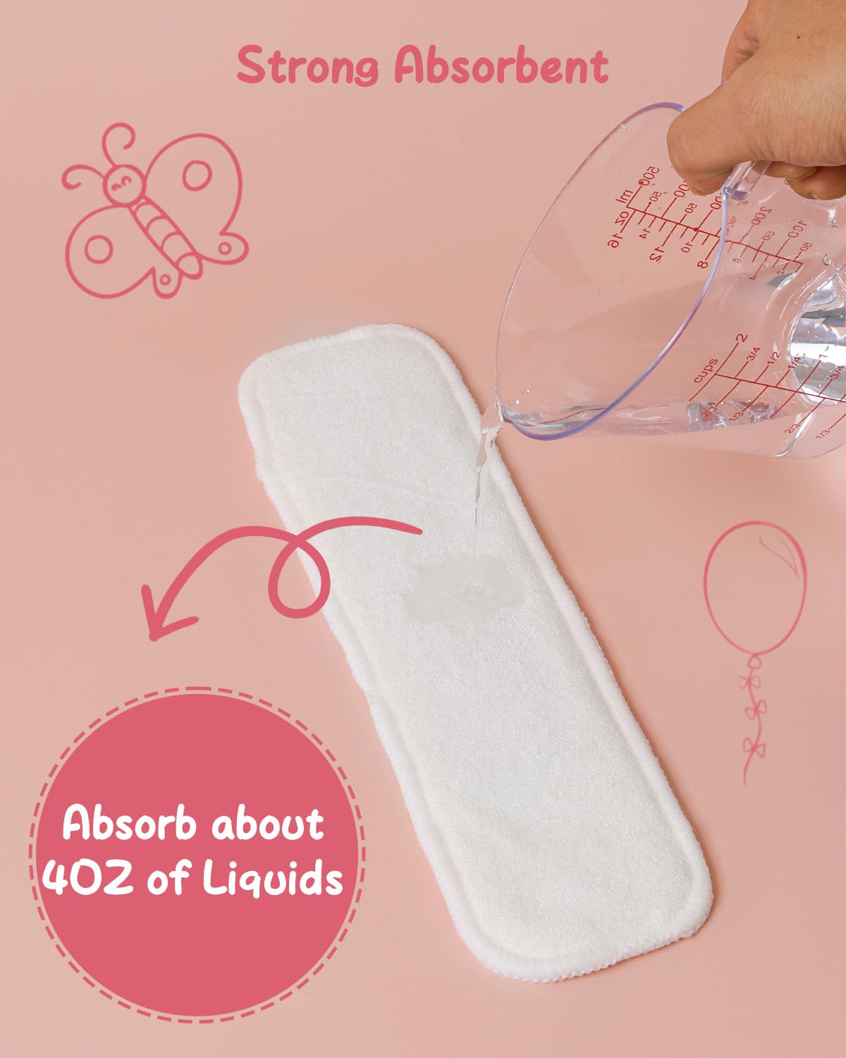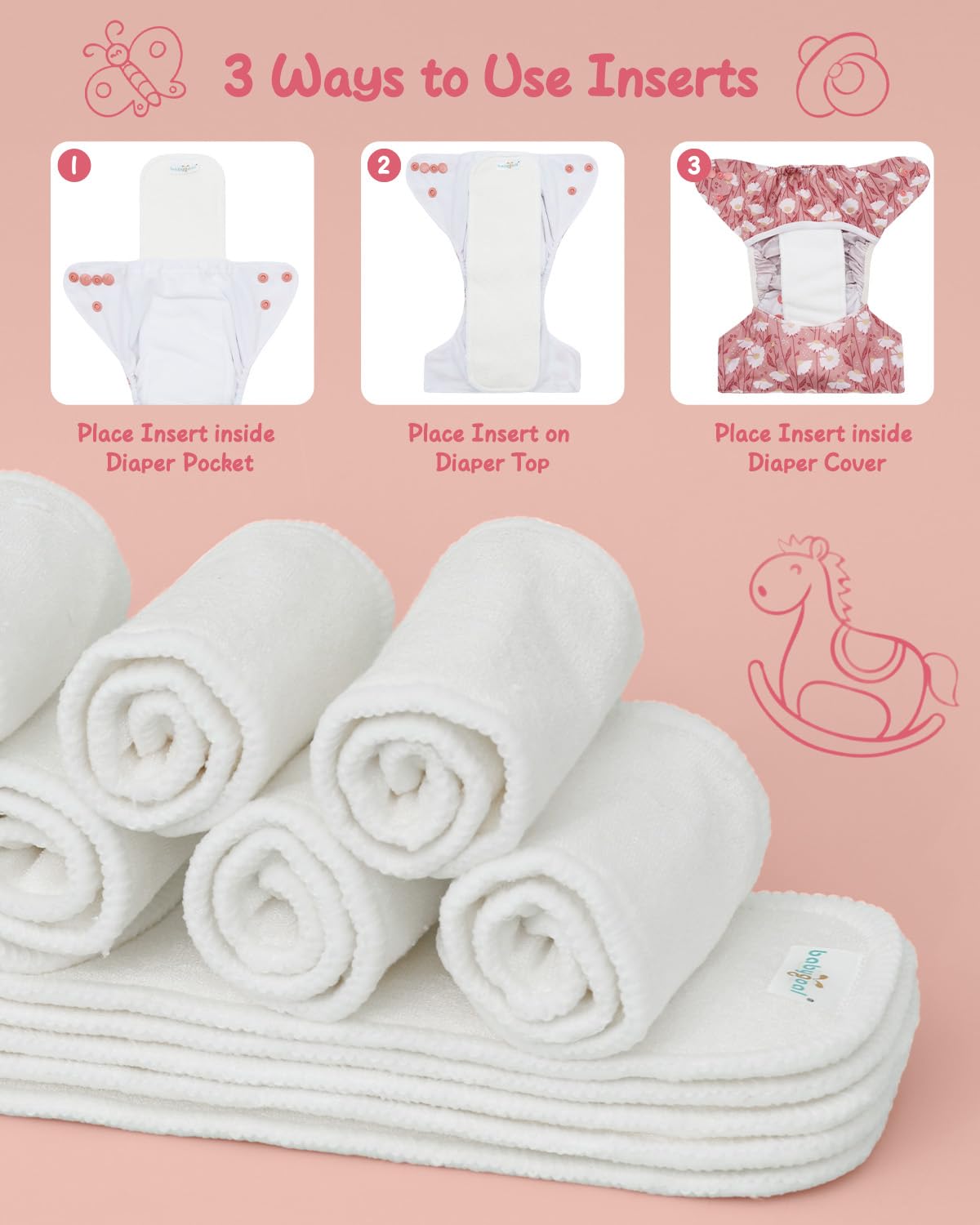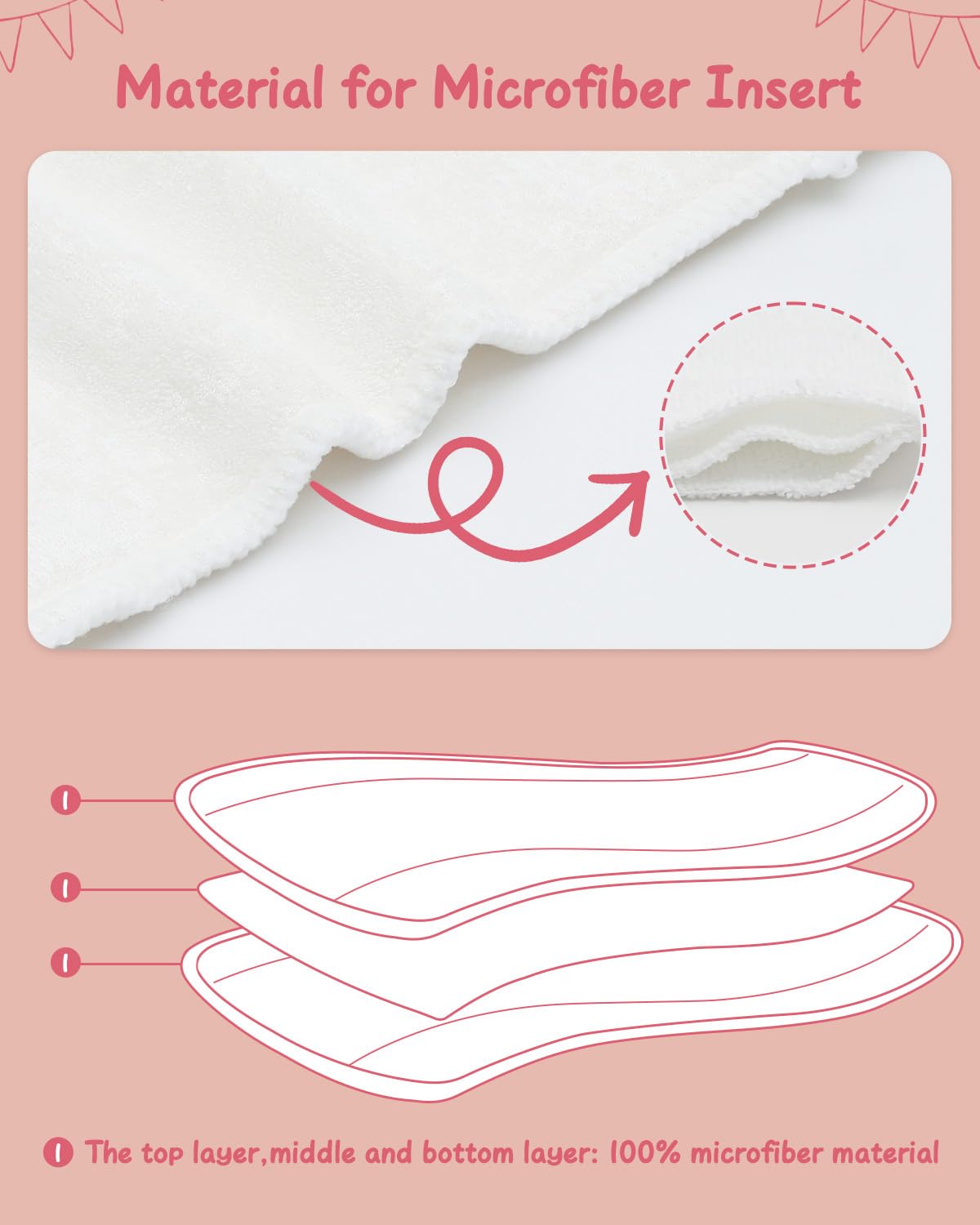 Super Absorbent and Soft: The inserts are made of 3 layer of microfiber. The strong absorbent material with breathability and softness is gentle on your babies' bottom, keeping your baby dry and comfortable. They will become more absorbent when they are washed.