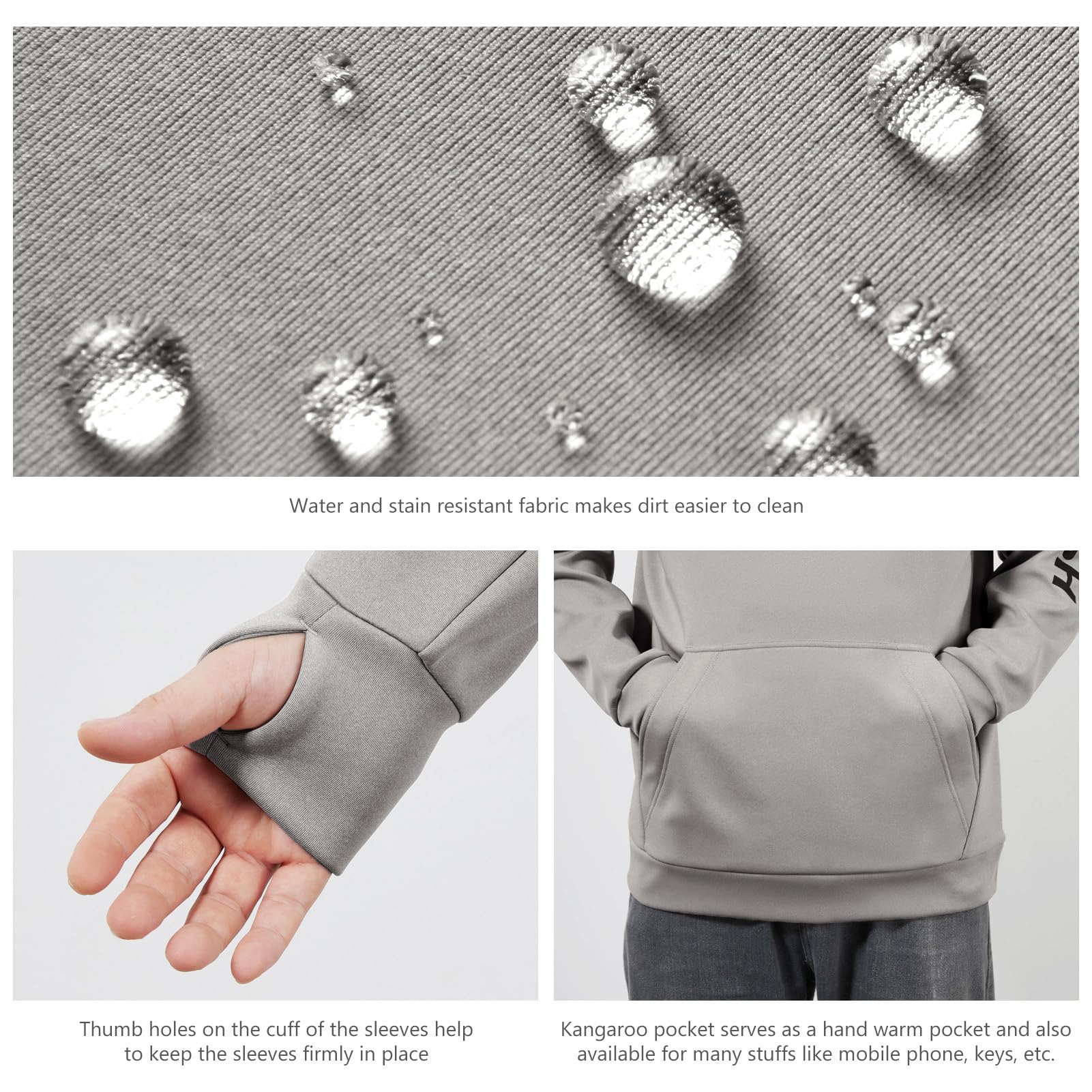 Big kangaroo pocket serves as a hand warm pocket and is also available for personal stuffs like mobile phone, keys, etc; Thumb holes on the sleeve cuffs help to keep the sleeves firmly in place