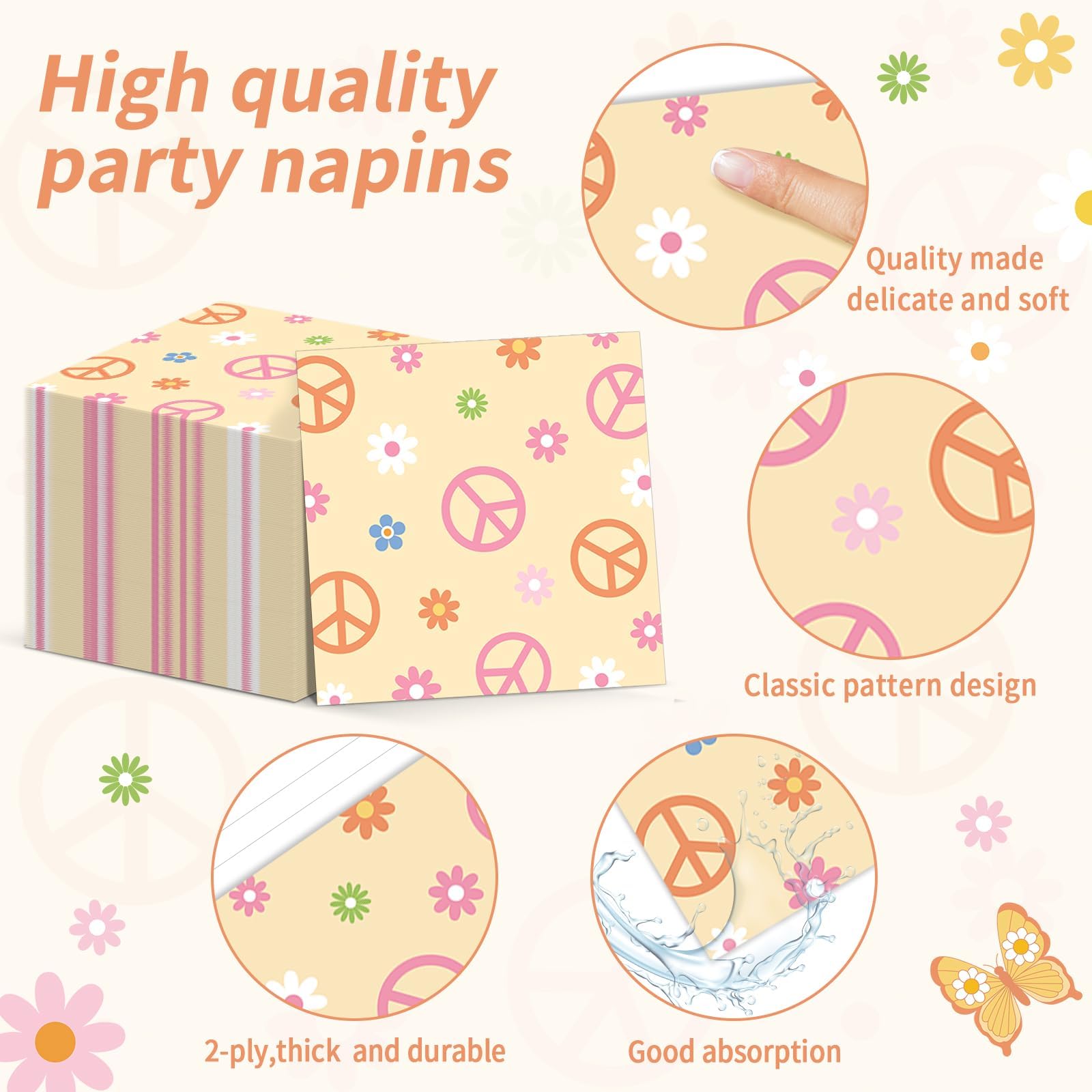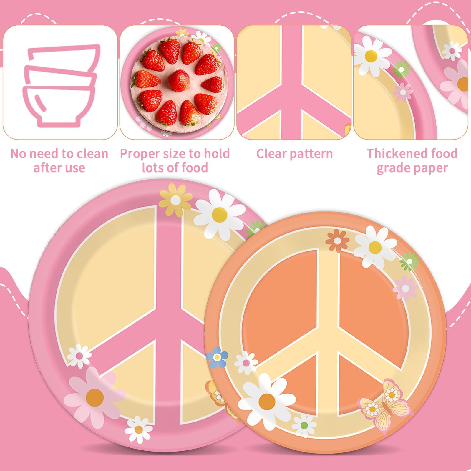 Wide application: This retro peace sign tableware could apply for retro boho party, groovy party, daisy flower party, hippie party etc, wonderful for indoor and outdoor uses: dinning, home, kitchen, restaurant, catering, cafe, BBQ, buffets etc. These retro peace sign themed tableware supplies packs also are a wonderful complement with your party tablecloth, party banner, party bags, party backdrops etc.