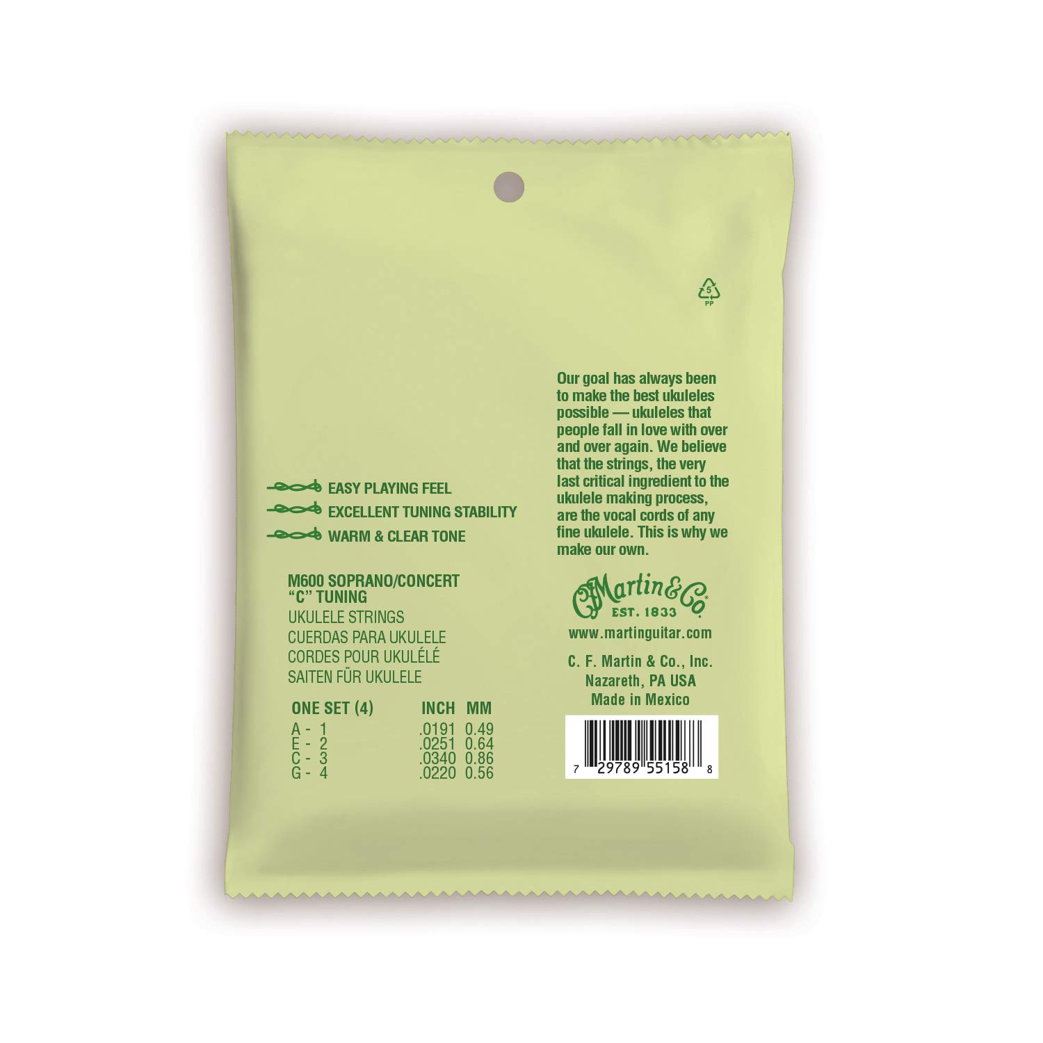 Martin's Ukulele Strings provide an easy playing feel, excellent tuning stability, and a consistent, clear tone. Made from clear fluorocarbon, these strings are light enough to strum and pick easily but strong enough to hold tunings. Designed to produce a warm, mellow tone, these concert-gauge strings provide excellent tuning stability and playability so your ukulele can stand up to rigorous practice and performance schedules. This pack of professional-grade strings will last through long sing-alongs, late-night practice sessions, and plenty of performances. It's an ultra-reliable set of strings that you can take on tour or keep in the studio. Whether you're a beginner or professional musician, this set of ukulele strings will help you play to your potential. Lead a sing-along around the campfire or provide the background music while the sun sets at the beach. With these ukulele strings, you'll be able to play to your heart's content. With this pack, you'll receive 4 soprano-gauge ukulele strings designed for optimal playing performance. The A string measures 0.0191", the E string measures 0.0251", the C string measures 0.0340", and the G string measures 0.0220". This total set of ukulele strings features a tension of 35.4, making it easy to get a warm, mellow tone with an ultra-flexible feel. Martin Guitar has been producing high-quality, musician-choice instruments and accessories since 1833. The Martin Fluorocarbon Ukulele Strings are the real deal—not an imitation. Discover your instrument's true voice with this professional-grade string pack.