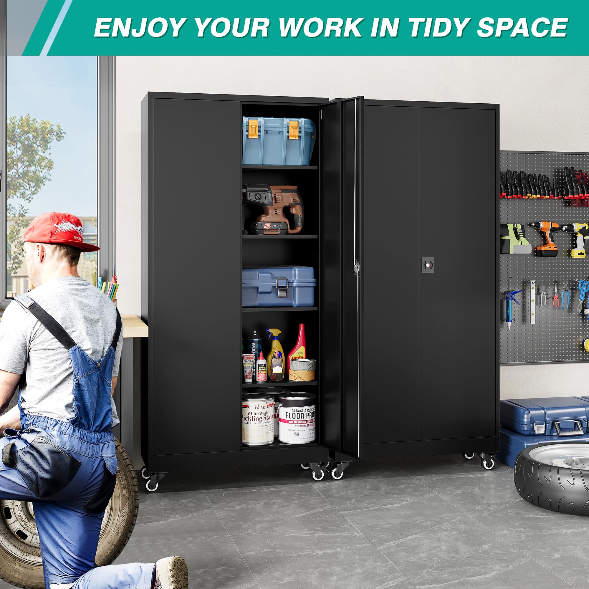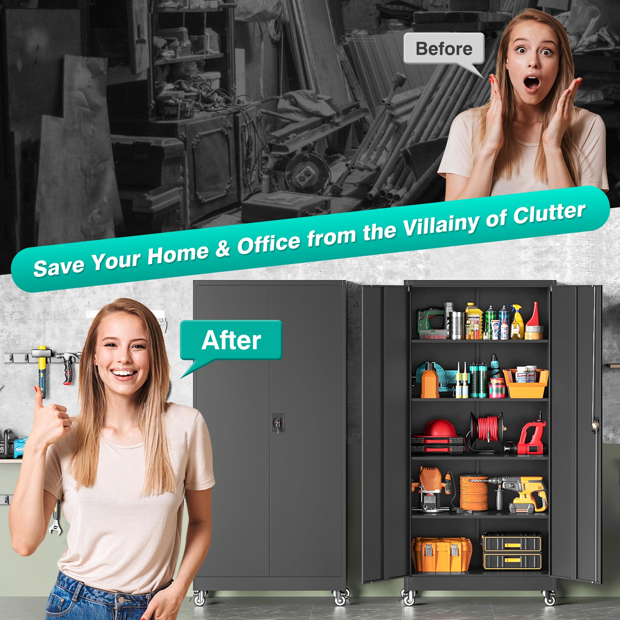 【5 Tiers for Large Capacity】: Lockable garage cabinets storage uses 4 adjustable shelves. You can move to the desired height by adjusting the shelf according to the size of the things. so that you can divide the tool cabinet space distribution. You can also design garage storage flexibly and remove the shelves for more standing room.