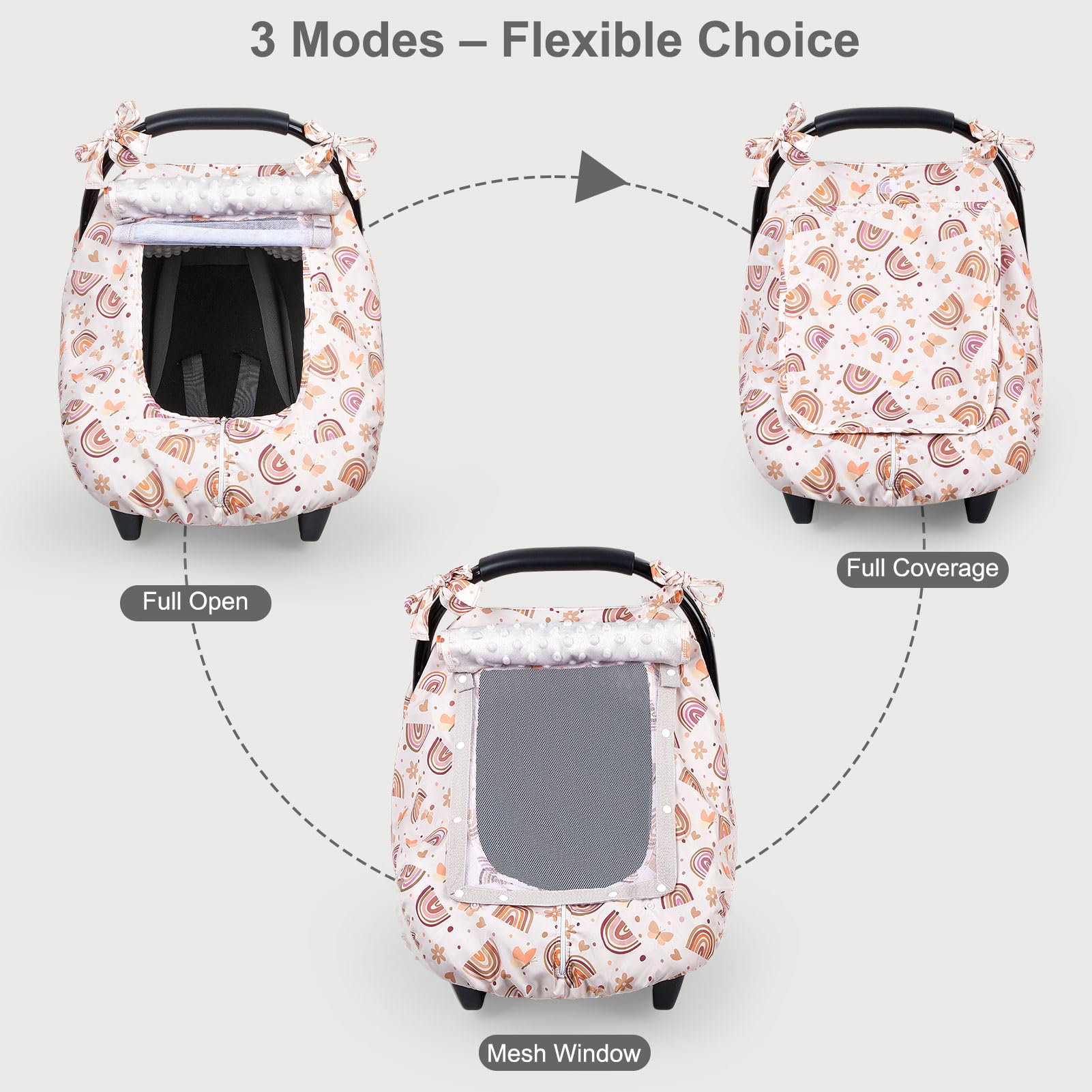 3 Usage Modes: The infant car seat cover has two layers of windows which has 3 usage modes in different scene; Full open mode match with half zipper, easy to get Inside and out for babies; Breathable mesh window can see babies clearly; Fully Coverage mode resists the cold wind, sunlight, rain