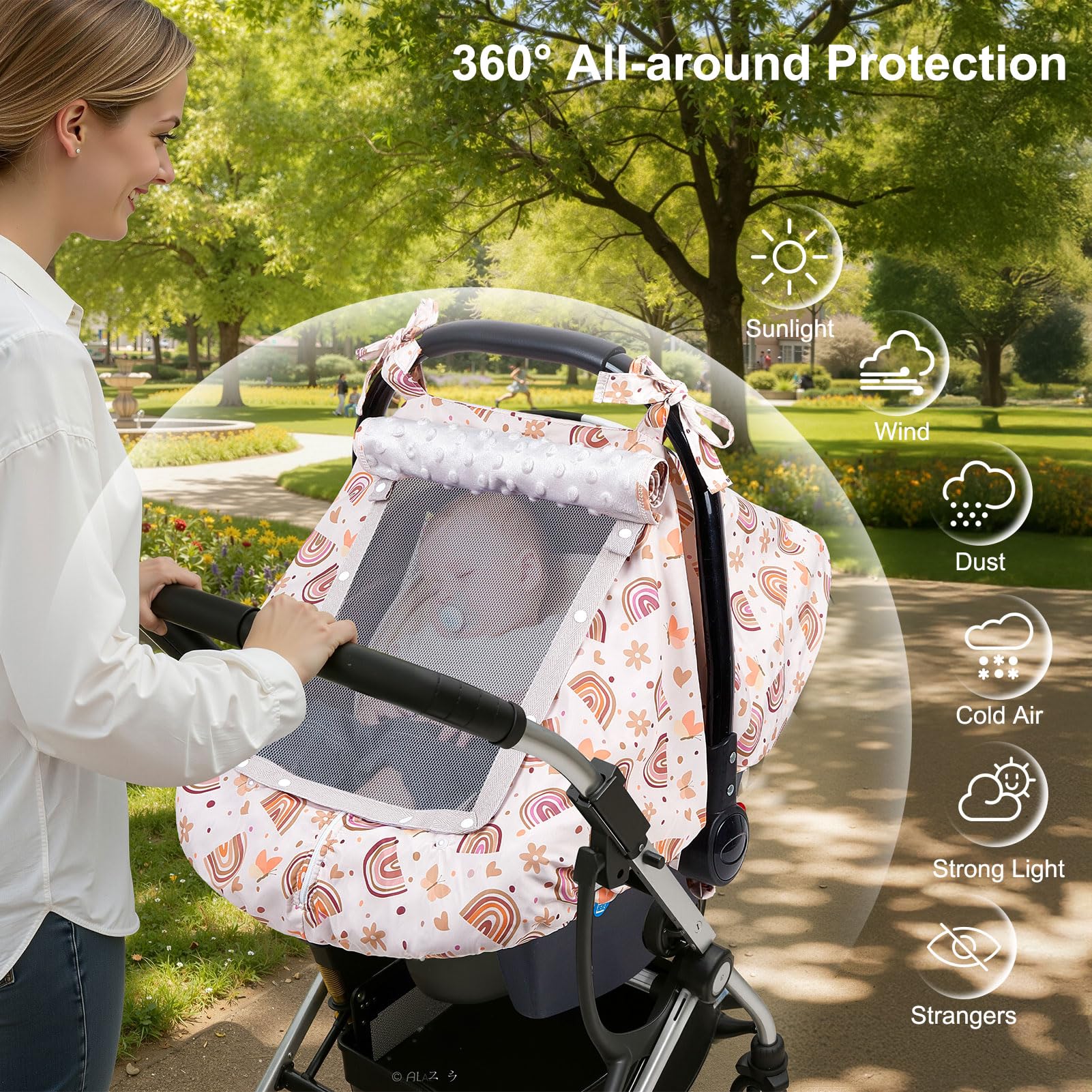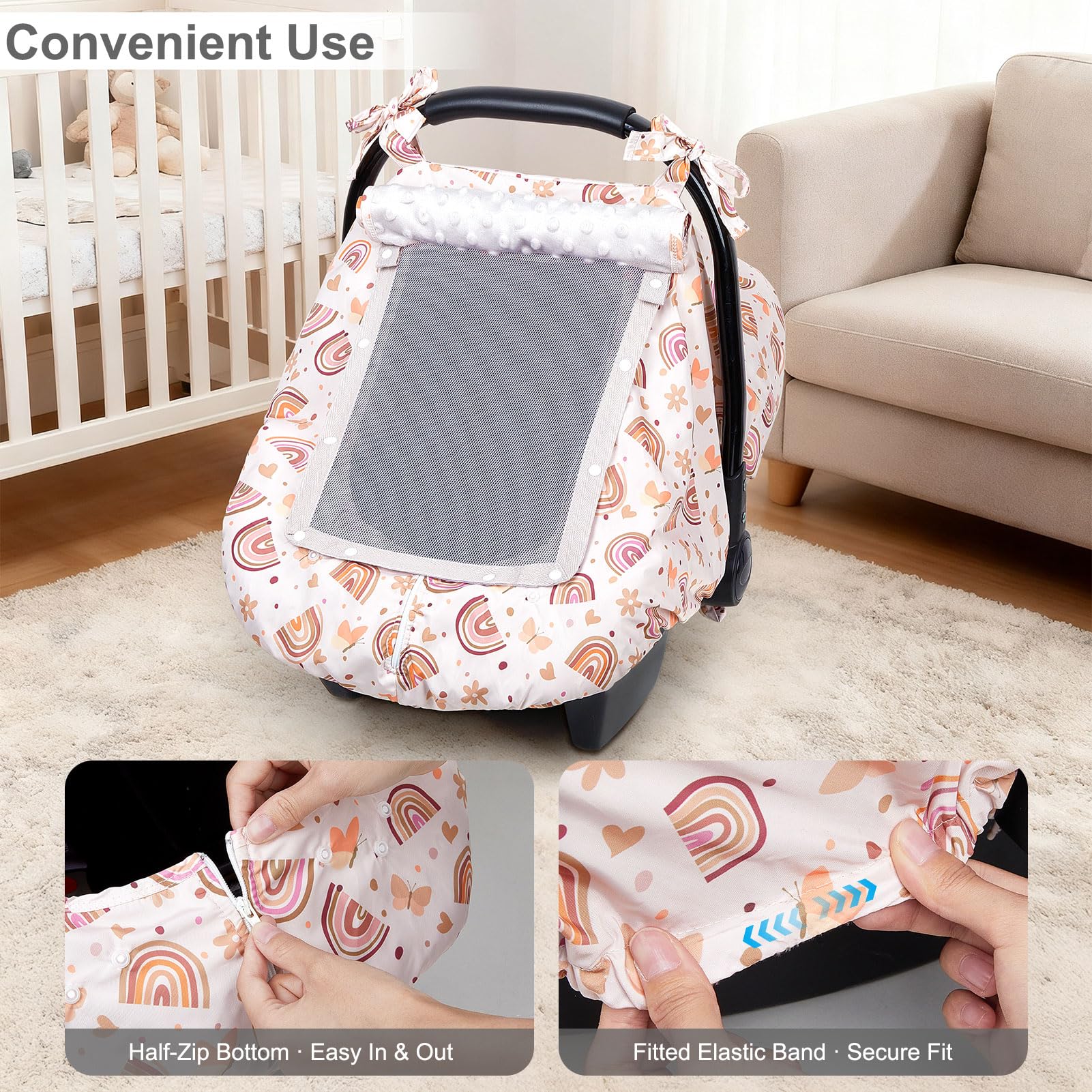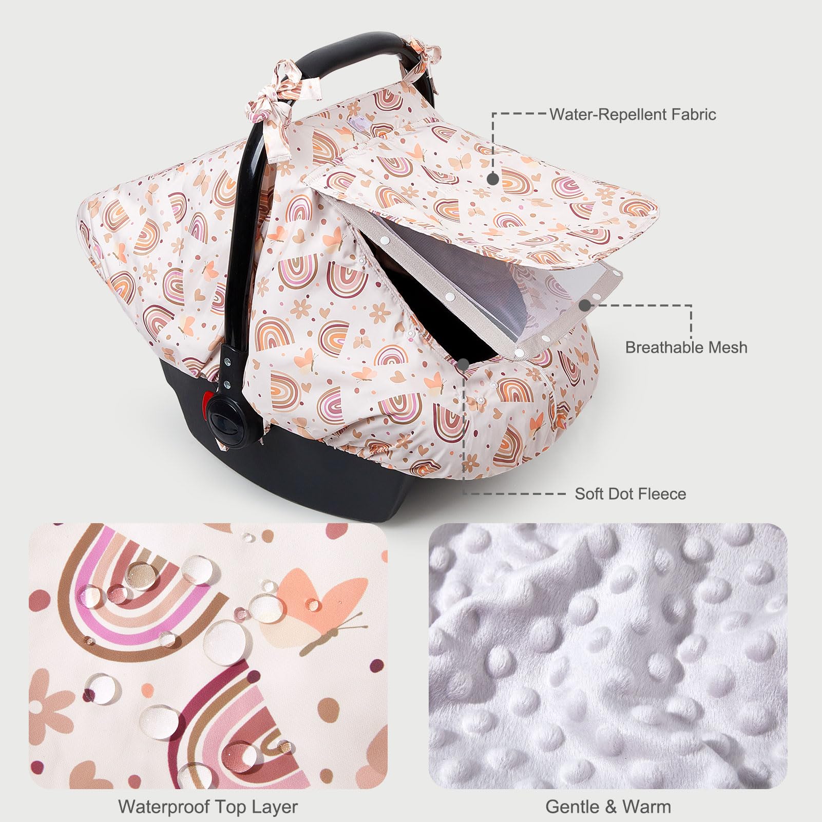 FIOBEE Baby Car Seat Cover, Car Seat Covers for Babies Infant Car Seat Canopy with Breathable Mesh Window Waterproof Carseat Cover for Babies Boy Girl 4 Seasons, Brown Rainbow