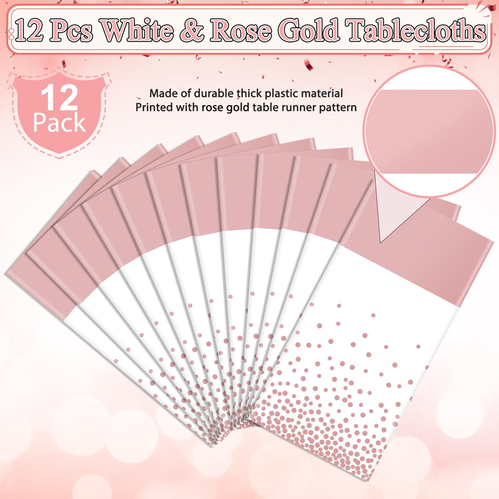 What will you receive: 12 pieces plastic white and rose gold party tablecloth,all over printed with rose gold dot on white background,the rose gold table runner in the middle is printed pattern,ideal for decorating your graduation birthday party supplies and decorations