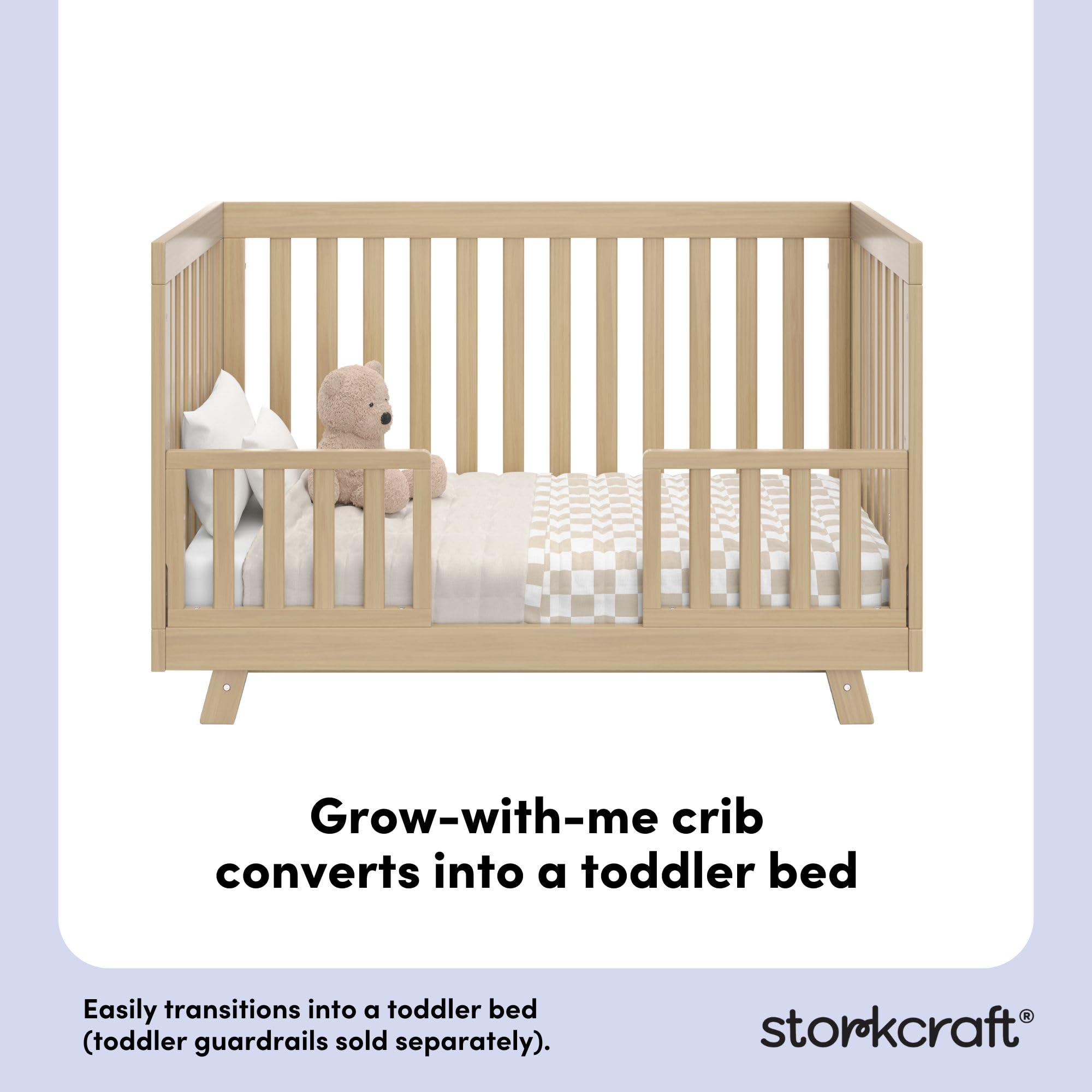 With its modern design and timeless details, the Storkcraft Beckett 3-in-1 Convertible Crib will instantly become the spotlight of your baby's nursery. The Storkcraft Beckett features clean lines and tapered feet for a touch of mid-century design. This crib will grow with your child as it easily converts to a toddler bed (optional Storkcraft Toddler Guardrail sold separately) and daybed and offers a three-position adjustable mattress base. The Storkcraft Beckett 3-in-1 Convertible Crib is certified by the Juvenile Products Manufacturers Association (JPMA) and is stringently tested to meet or exceed all applicable Consumer Products Safety Commission (CPSC) and American Society for Testing and Materials (ASTM) safety standards to ensure the safest sleep environment for your child. Storkcraft offers exceptional design and superior quality for your modern nursery.