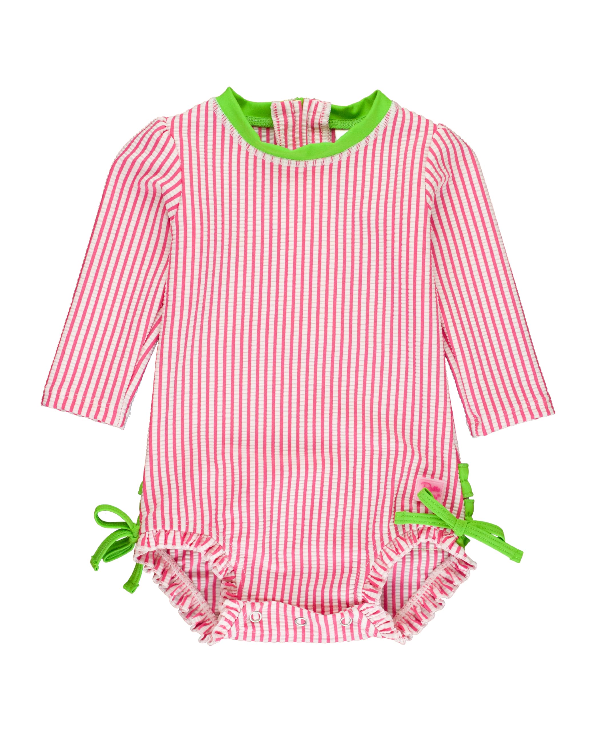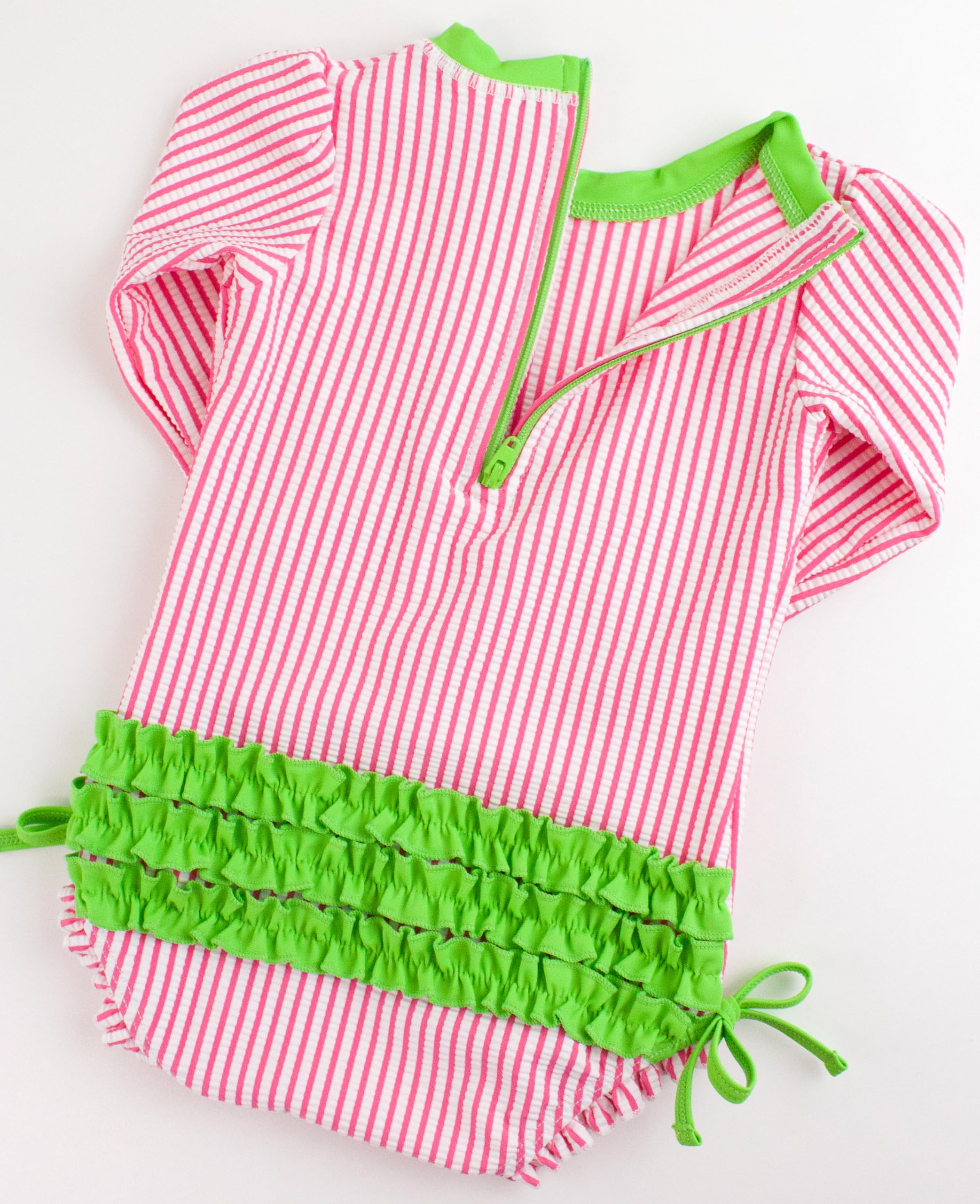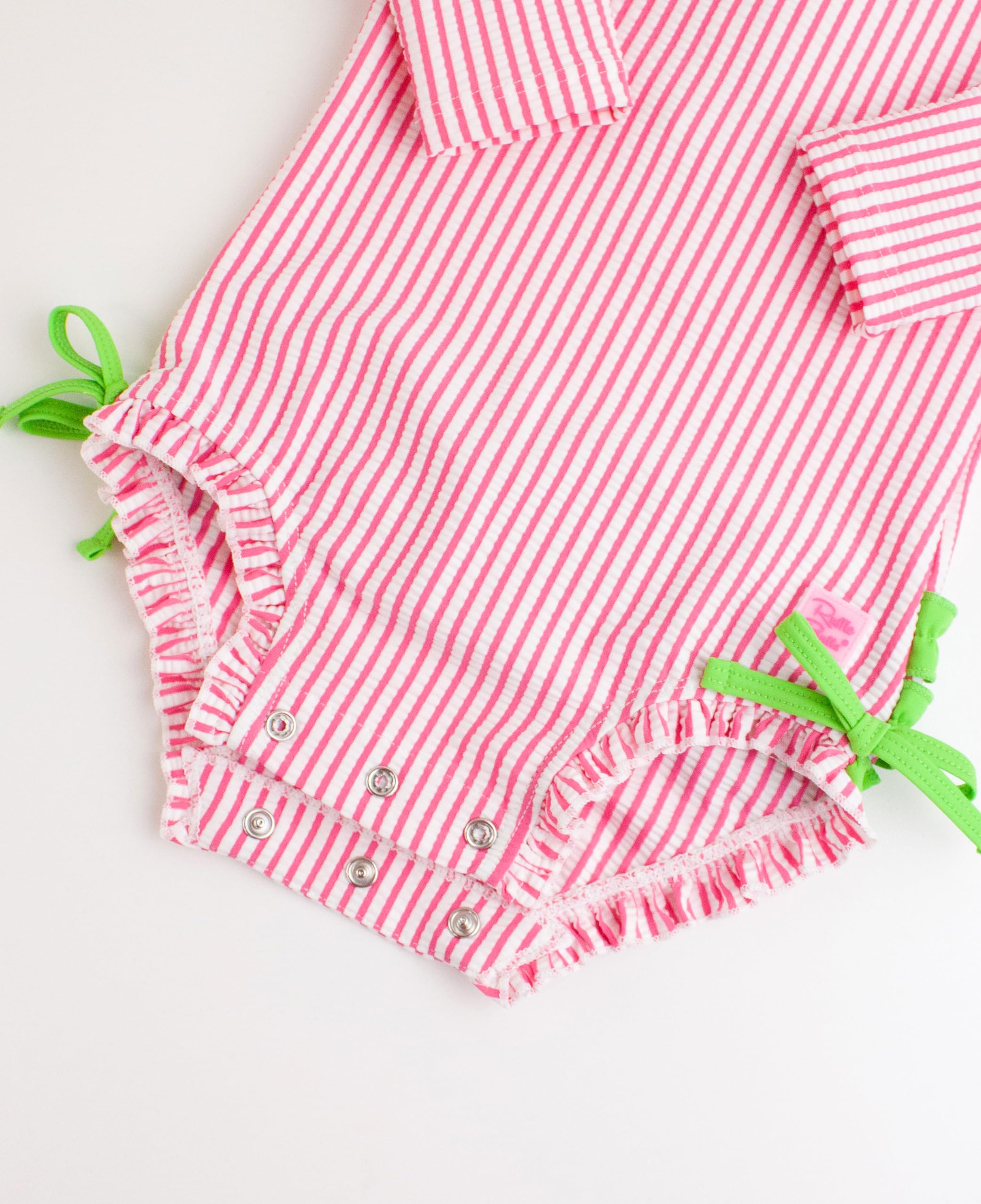 Description Made with a high quality UPF 50+ sun protected fabric, this unlined one piece seersucker bathing suit will keep safe in the sun all day long. Plus, the nickel-free snaps and back zipper make changing a breeze!