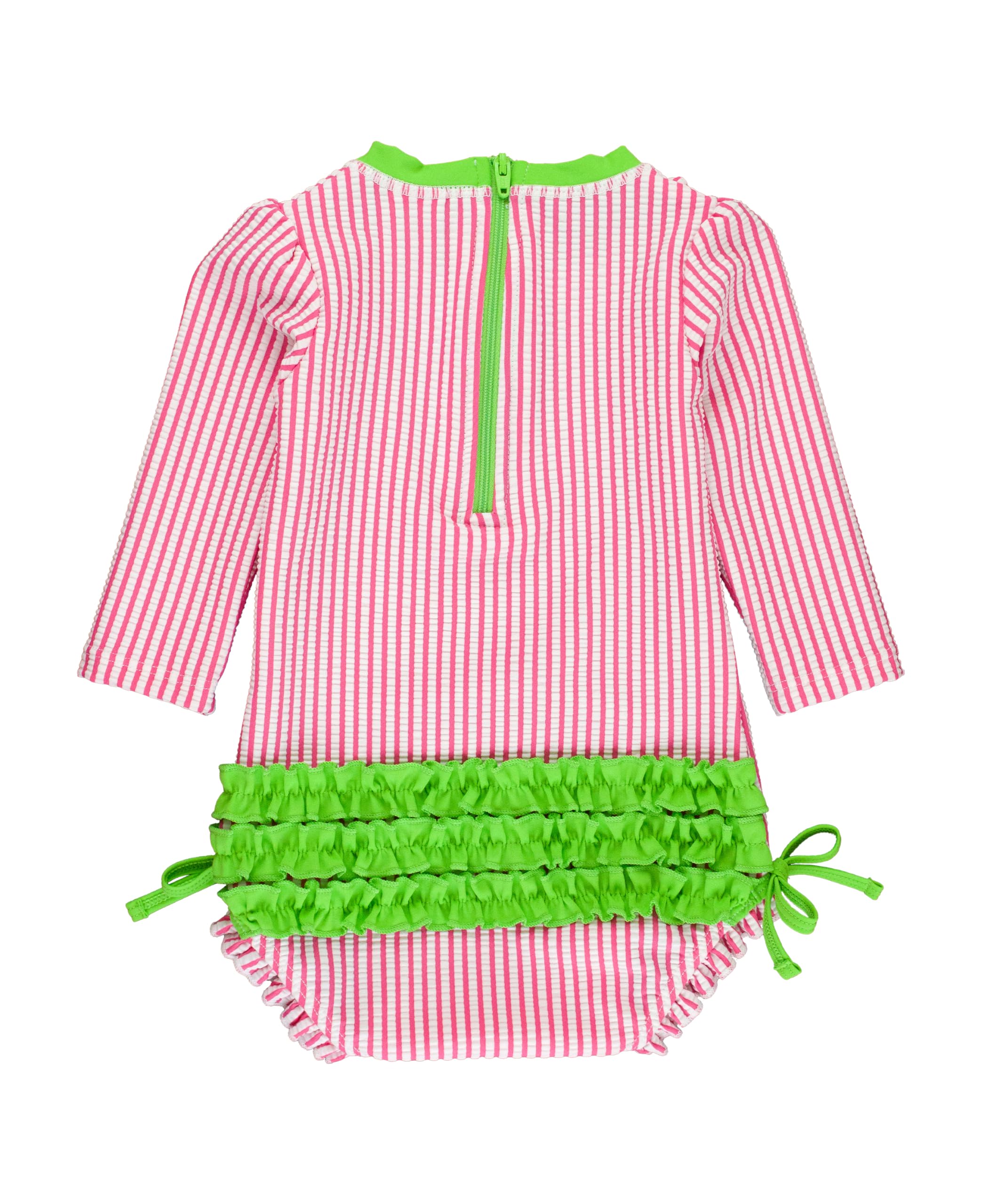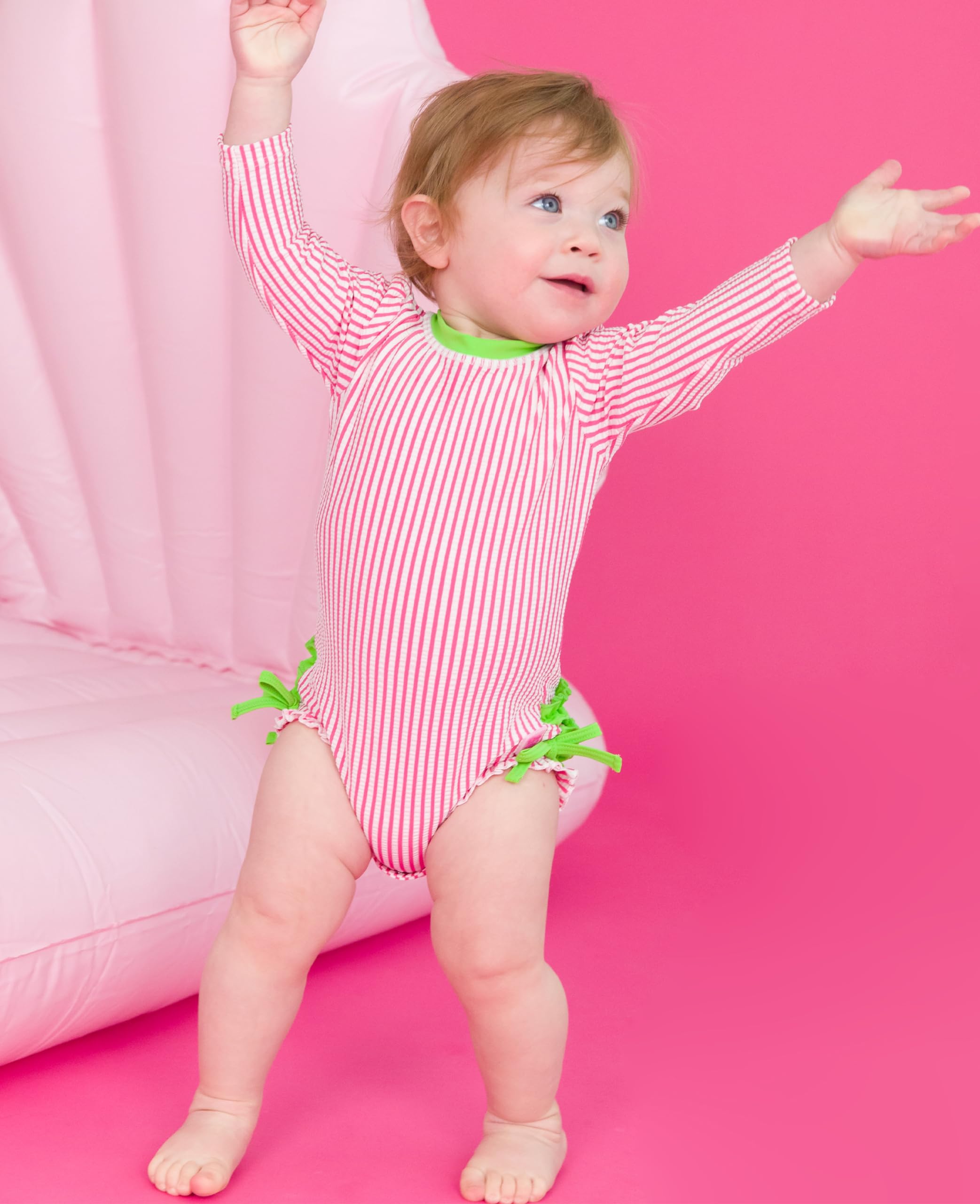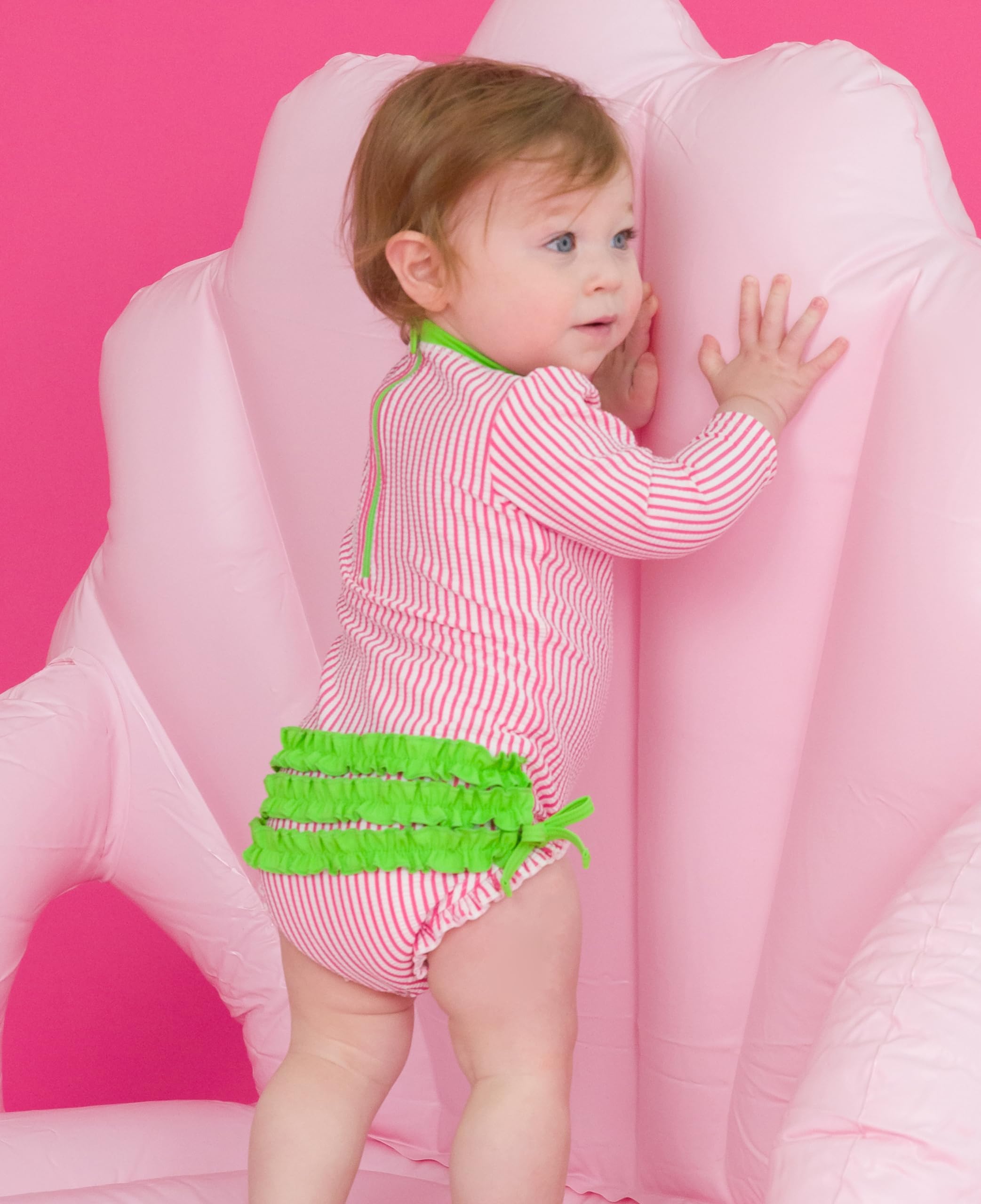 Description Made with a high quality UPF 50+ sun protected fabric, this unlined one piece seersucker bathing suit will keep safe in the sun all day long. Plus, the nickel-free snaps and back zipper make changing a breeze!