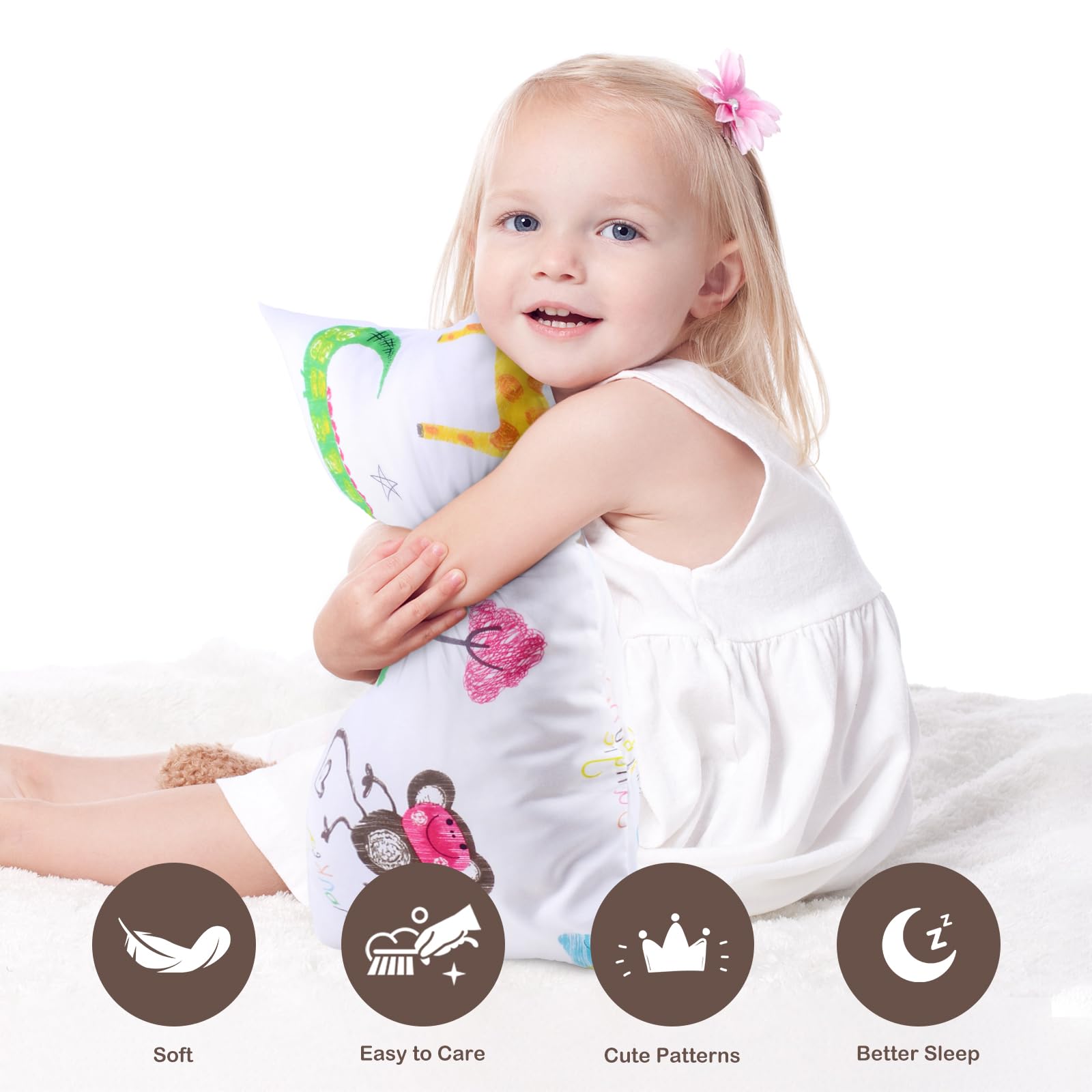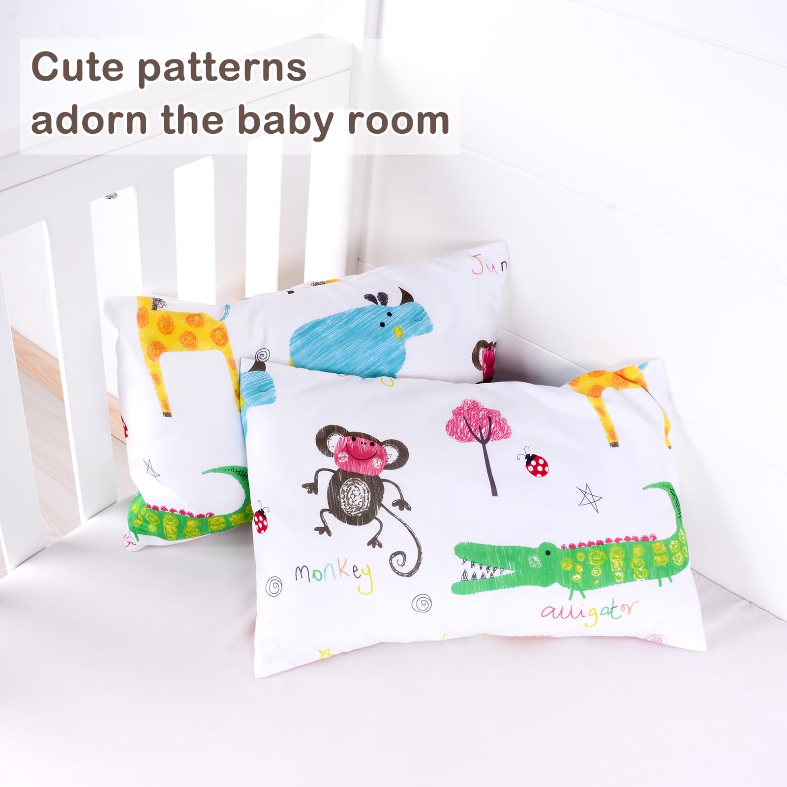 【TODDLER PILLOW MATERIAL】:our Kids Toddler Pillowcase is made by 100% high quality polyester and it is the most healthy, breathable lightweight fabric, which is gentle to the touch and your baby delicate skin ,Naturally hypoallergenic cotton is very safe for sensitive skin of babies. Super Soft cozy and breathable feature offers toddlers and babies a good sleep and daily rest.