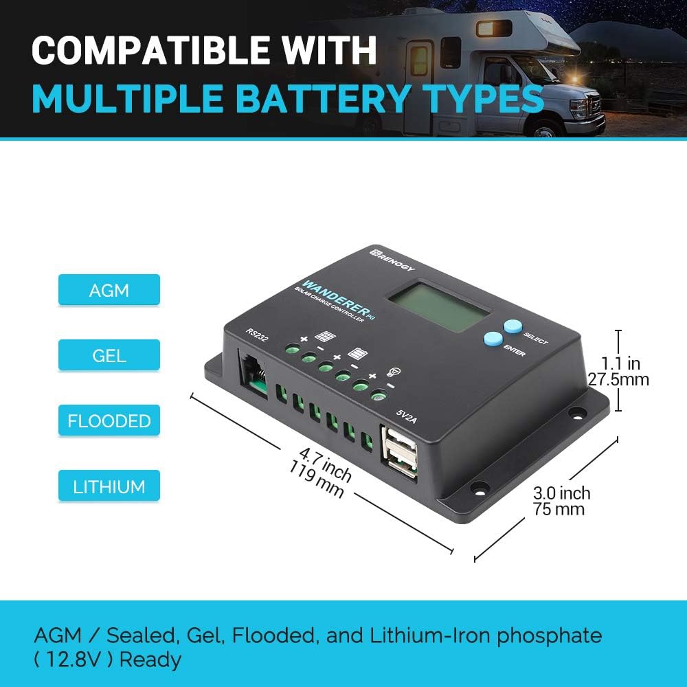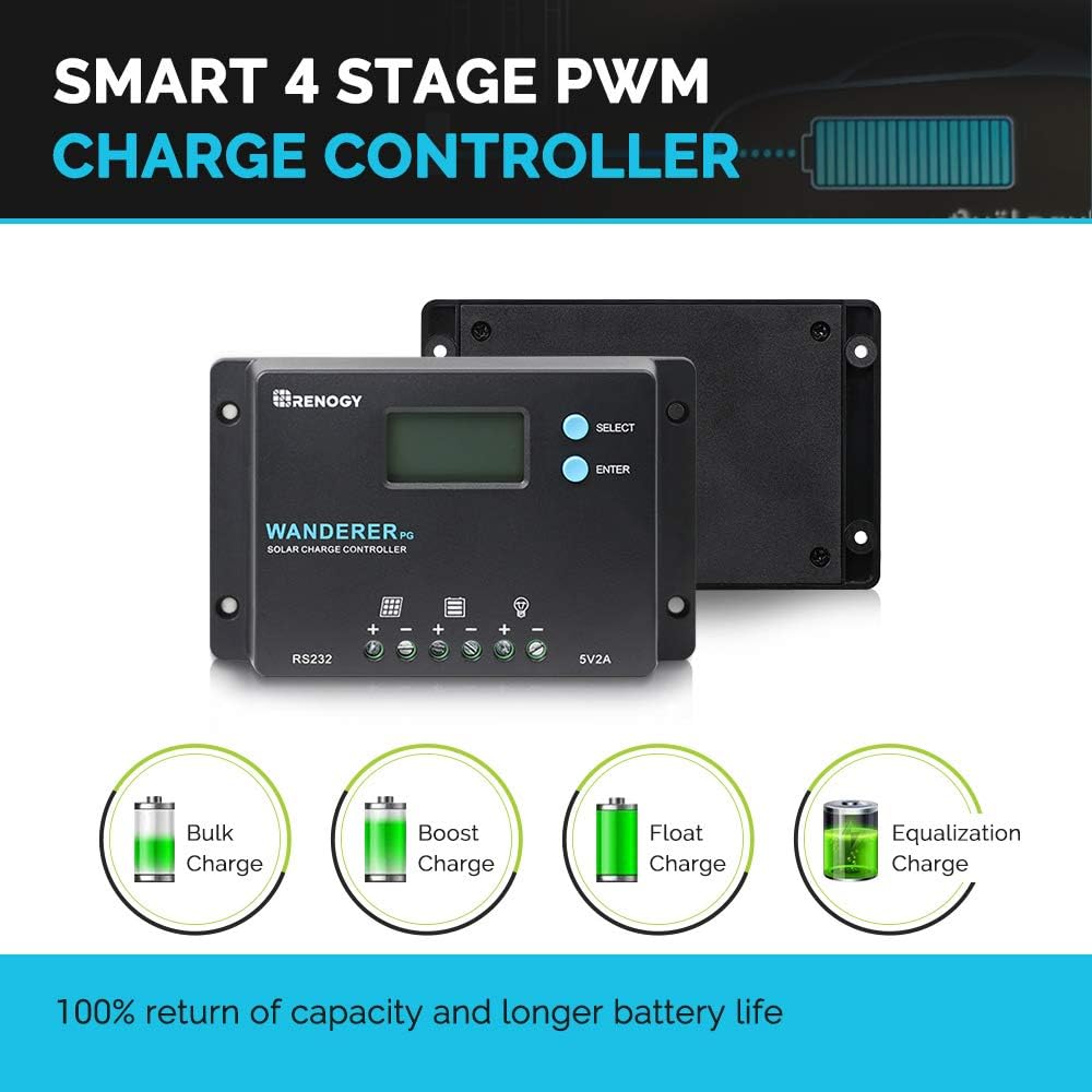 Smart 4-Stage 12V/24V Solar Charge Controller: Renogy charge controller maximizes Battery Life & Solar Efficiency, this advanced pwm solar charge controller utilizes intelligent 4-stage charging (Bulk/Boost/ Float/Equalization) to optimize power delivery for AGM, Gel, Flooded batteries