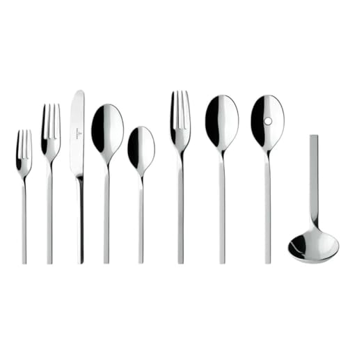 DELIVERY CONTENTS: Villeroy & Boch NewWave 64 pc set, 12 x dinner fork (8x.7x1.1 in) 12 x dinner knife (9.3x.78x.5 in) 12 x dinner spoon (8x1.65x1.1 in) 12 dessert fork (7.12x.9x.6 in) 12 x tea spoon (6.06x1.3x.79 in) 1 each serving fork, serving spoon, slotted spoon, sauce ladle
