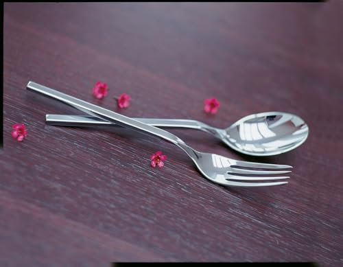 ELEGANT SET: This set is dishwasher safe and includes 12 x dinner forks, 12 x knives, 12 x spoons, 12 x coffee spoons, and 12 x cake forks, 1 x serving fork, 1 x serving spoon, 1 x slotted spoon, and 1 x sauce ladle. Add contemporary appeal to your table with this set of flatware that is crafted of 18/10 stainless steel for a glossy, high-end look.